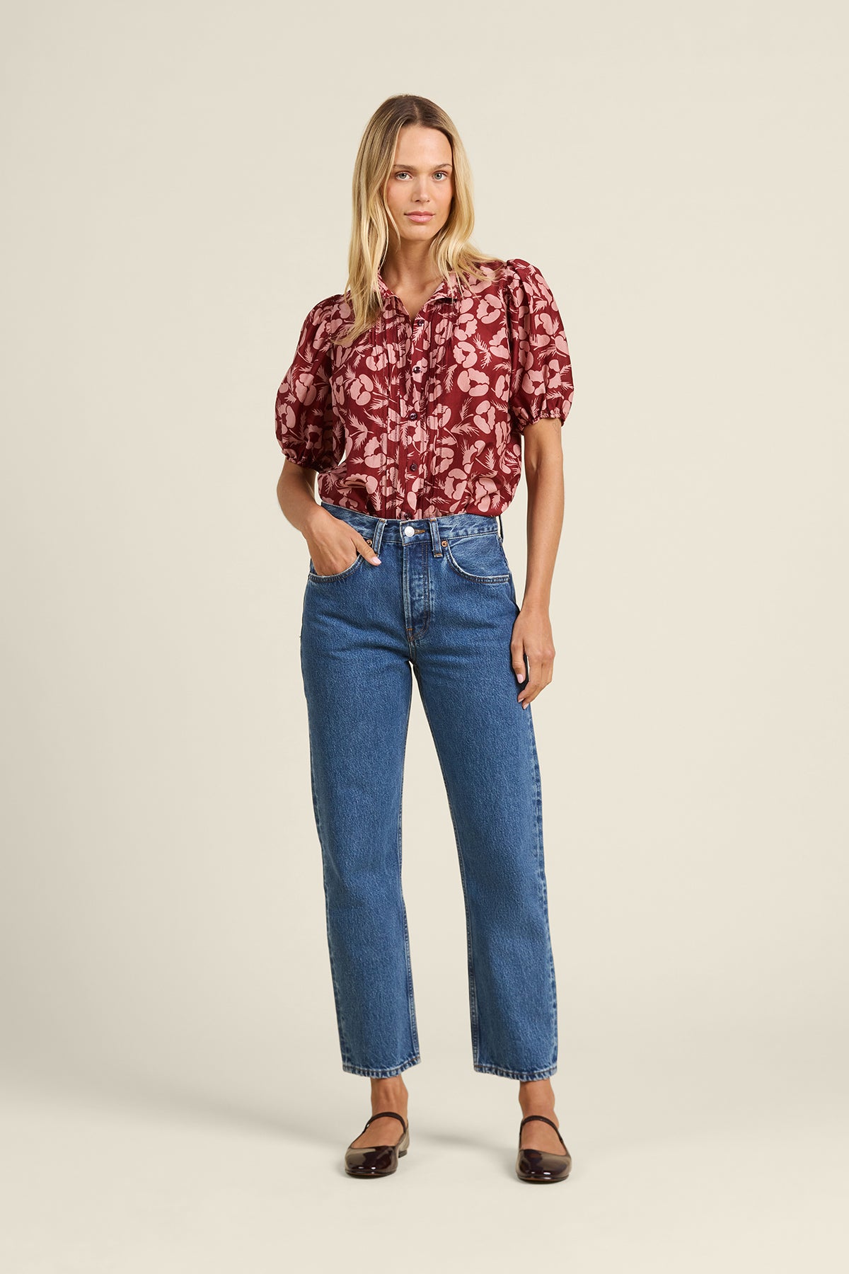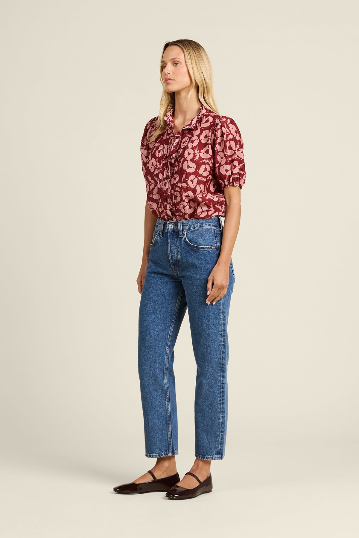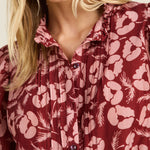 The Mira Blouse in Briar Rosewood print features a stylish pattern and a flattering fit. Lightweight and comfortable, it’s perfect for any occasion, easily paired with pants or jeans.