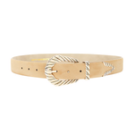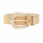 Western-inspired belt with textured sided design and polished gold buckle. Versatile enough for casual or dressed-up looks.