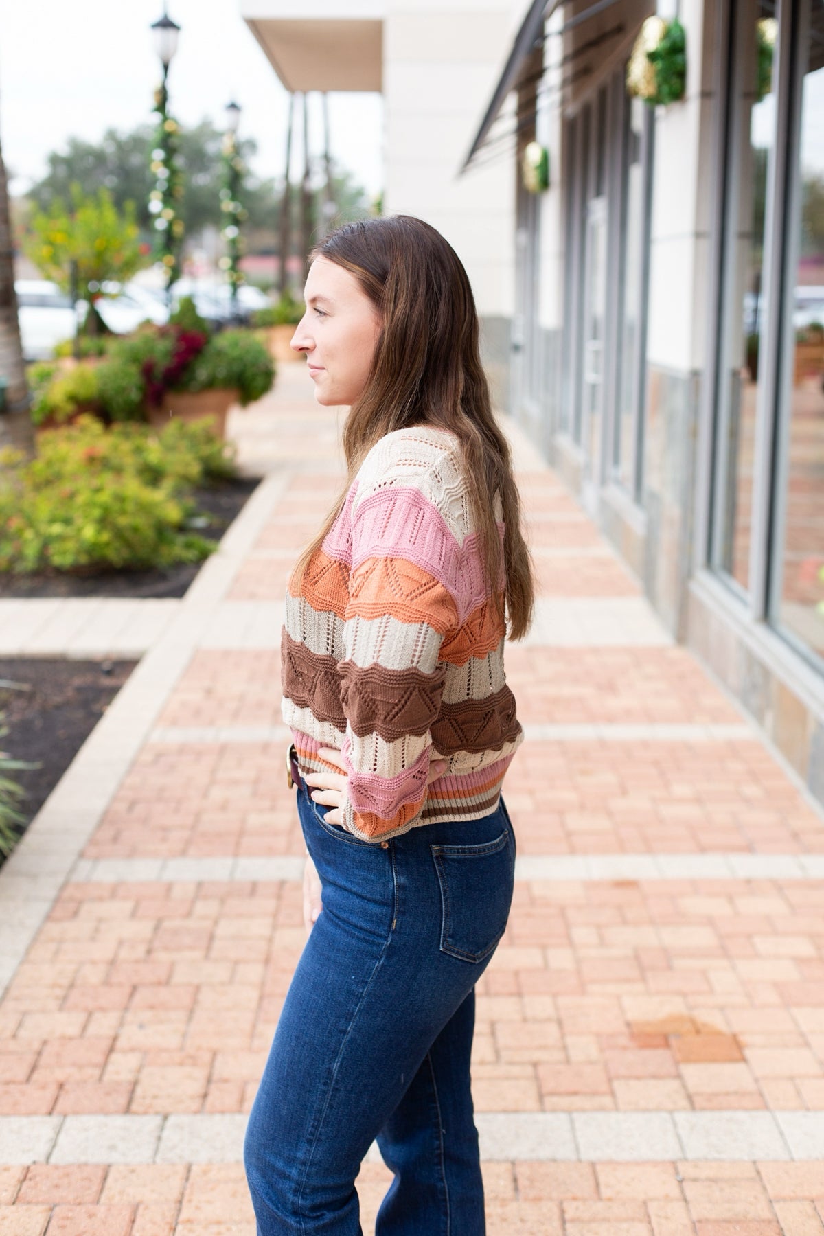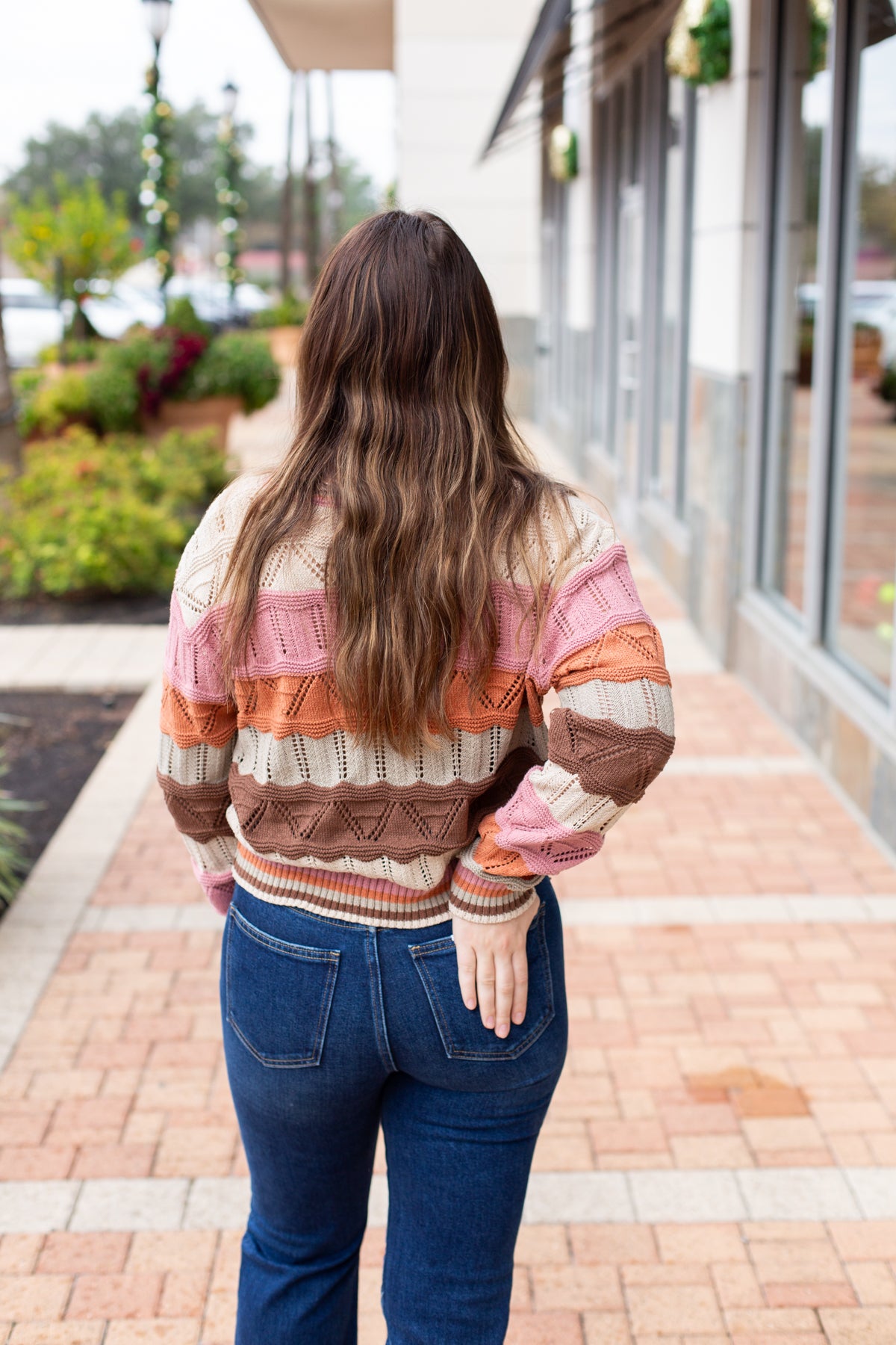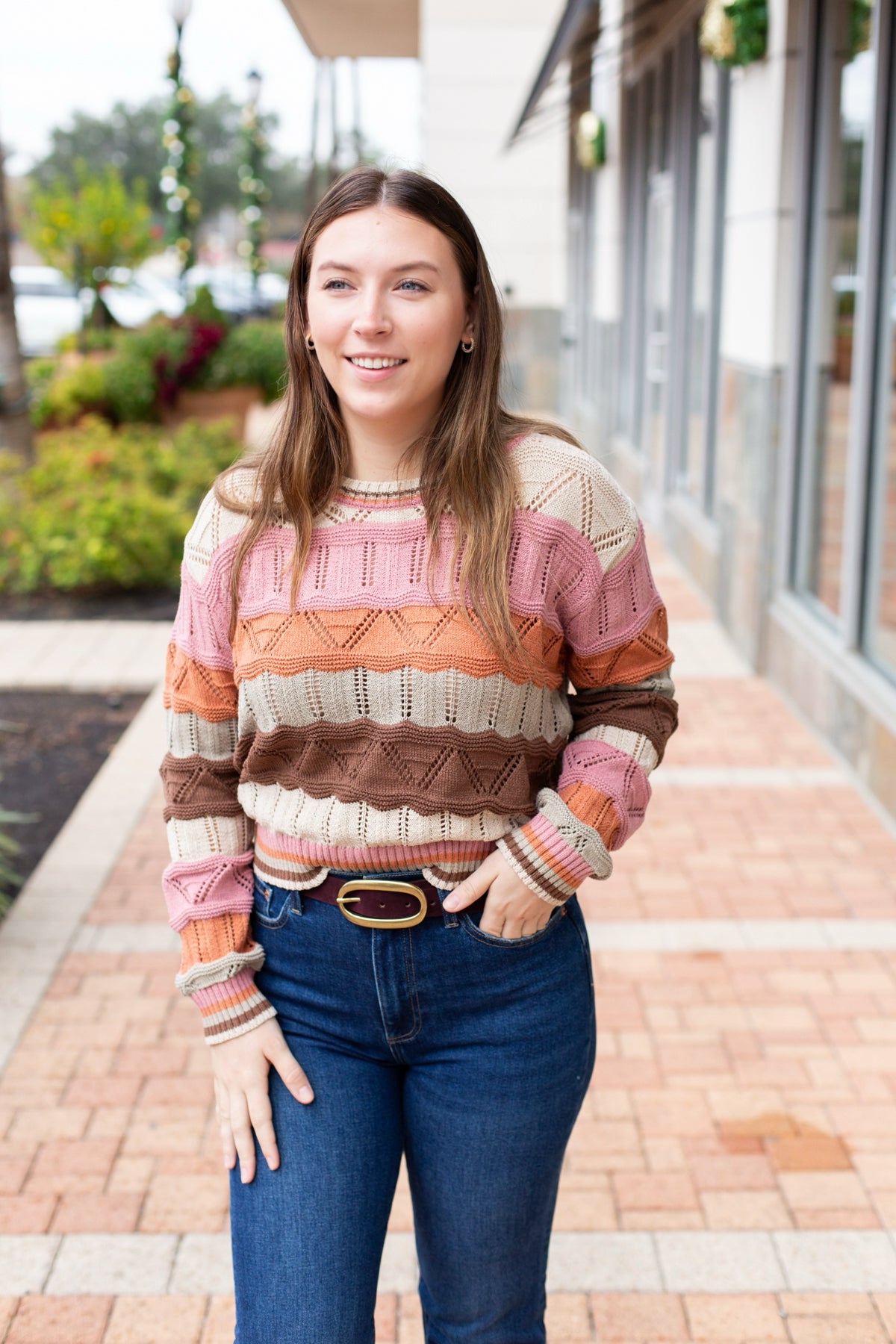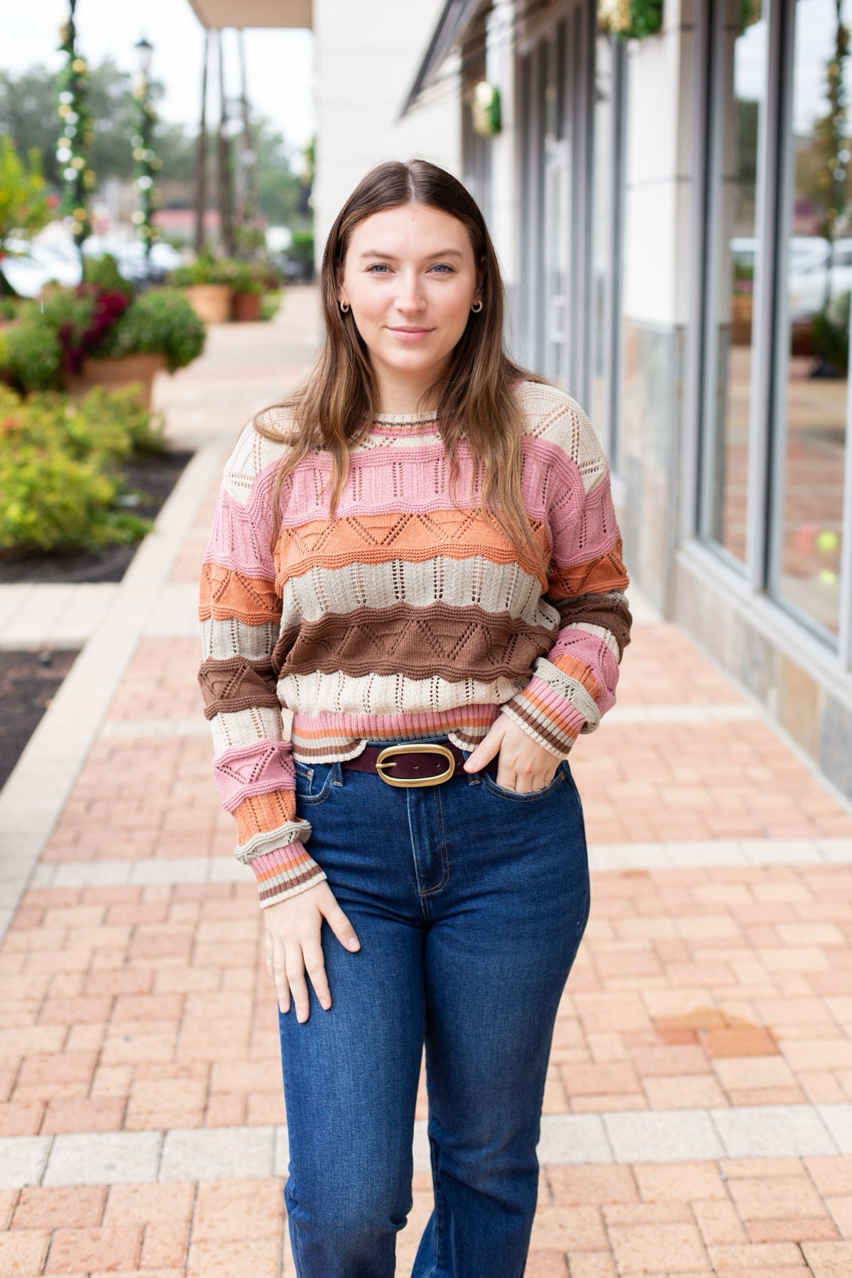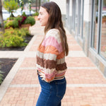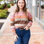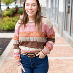 This multi-color wavy stripe sweater features a beautiful brown, pink, and oatmeal blend. The soft knit construction and eye-catching striped pattern make it a versatile piece that pairs easily with your everyday basics while adding instant style.