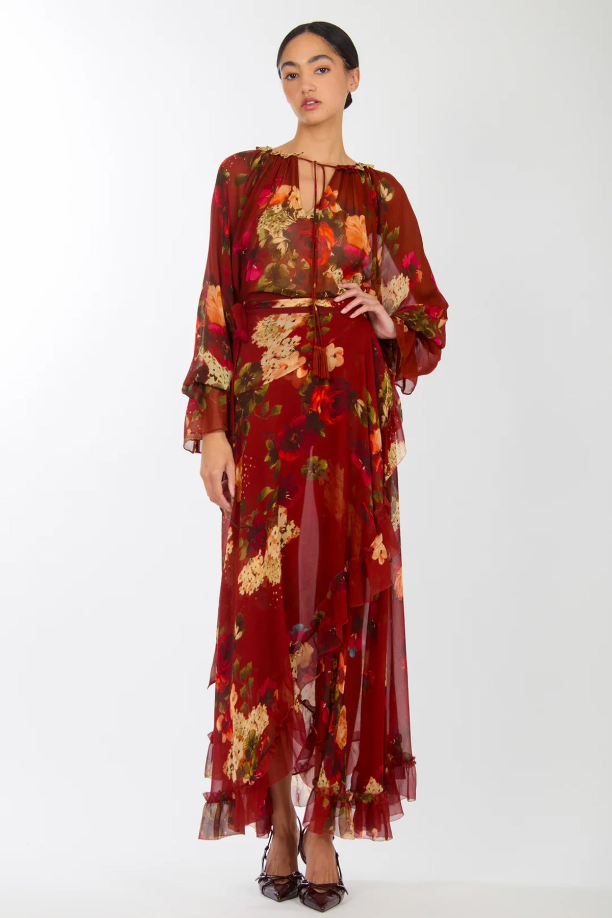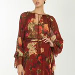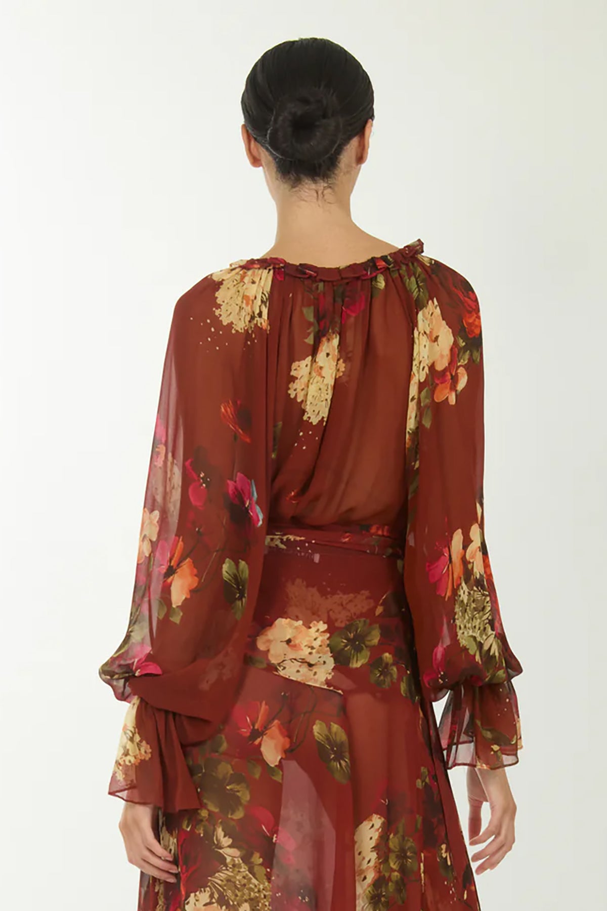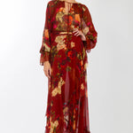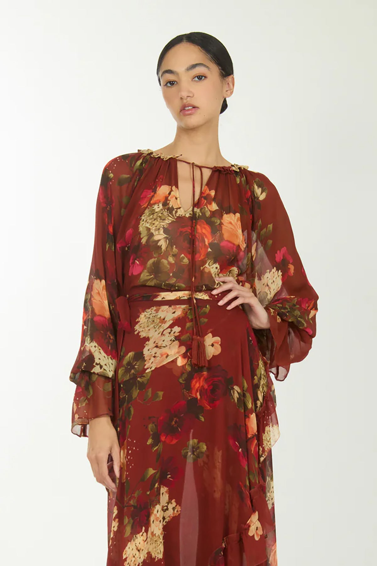 The Murray Blouse pairs timeless style with versatility. Crafted from 100% organic silk chiffon in a romantic rose floral print, it features a gathered neckline, tie detail, and billowy sleeves for effortless elegance. Includes a matching camisole that works beautifully on its own or layered underneath.