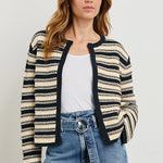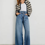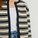 The Nelly Cardigan features a navy oat stripe pattern with a relaxed, boxy fit for modern casual style. Its cozy fabric and easy silhouette make it a versatile layering piece for any wardrobe.