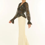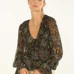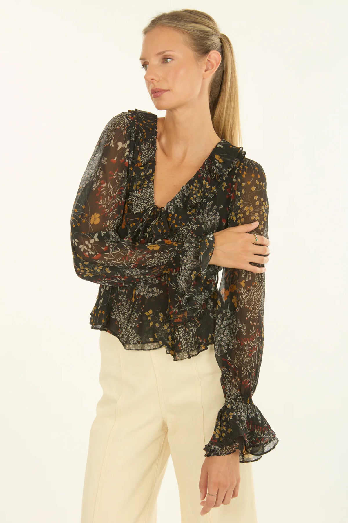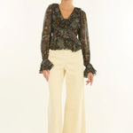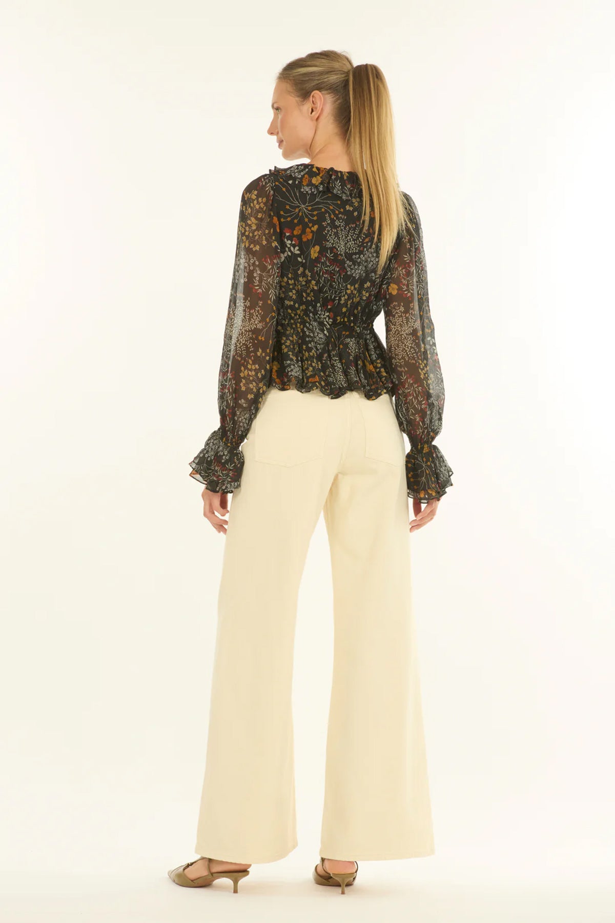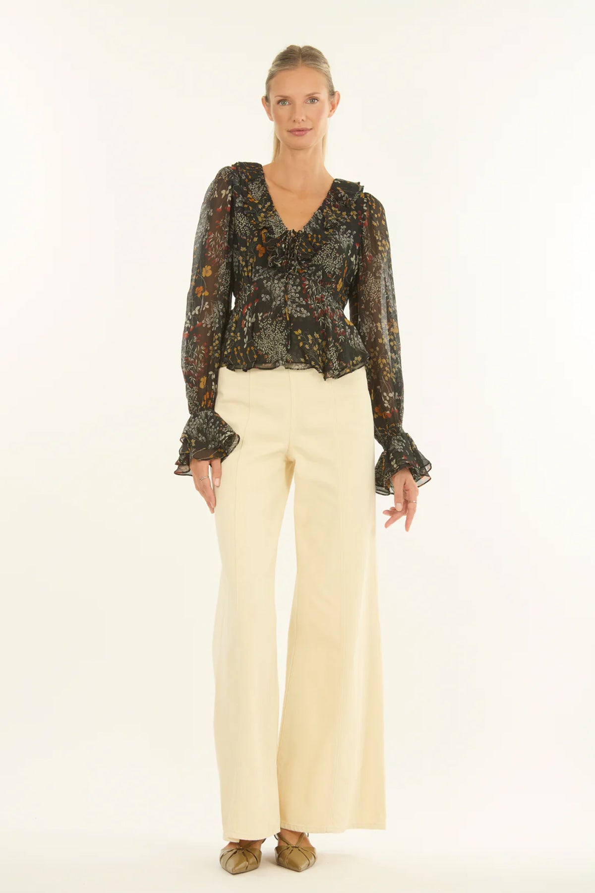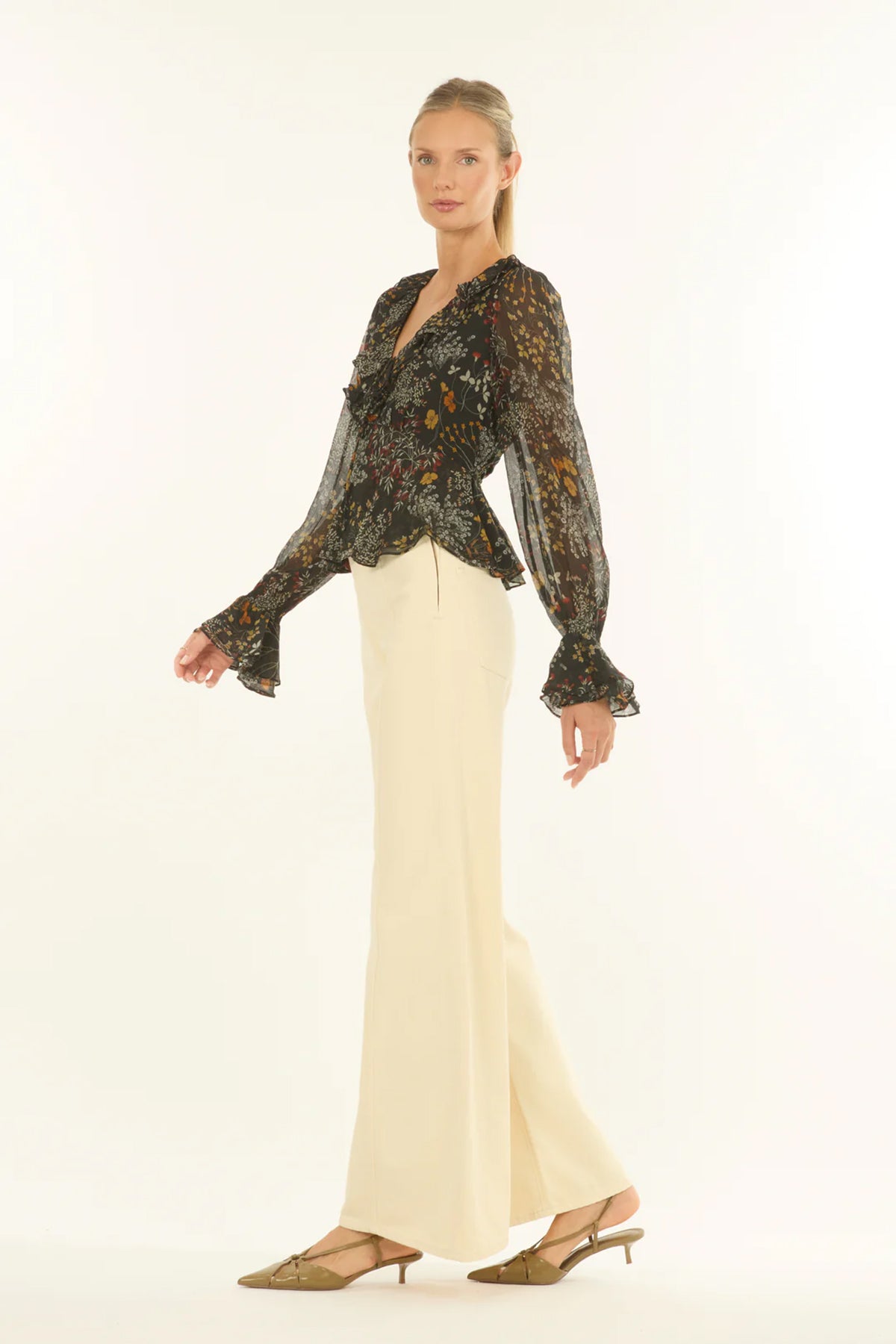 The Neveah Blouse features 100% organic silk chiffon in a Wildflower print with a deep V-neckline and front tie closure. Flared sleeves trimmed with soft ruffles create romantic movement and vintage-inspired charm.