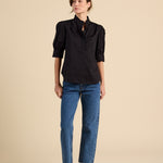 The Noah Blouse features short sleeves and ruffle details in a classic black design, adding a stylish and feminine touch to any outfit.
