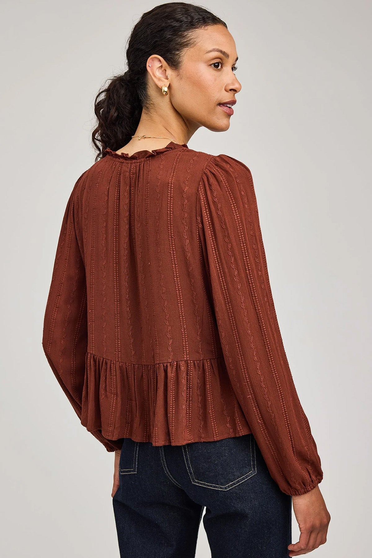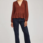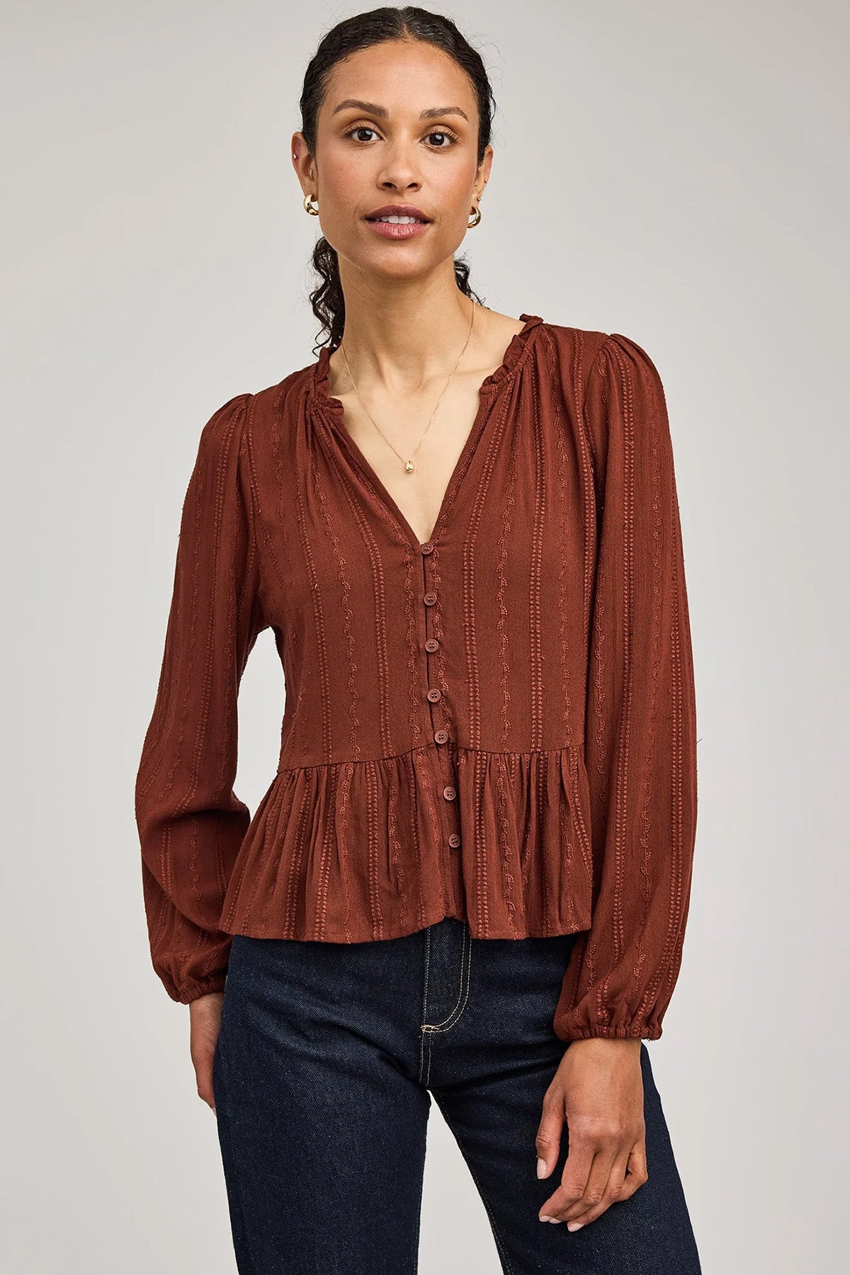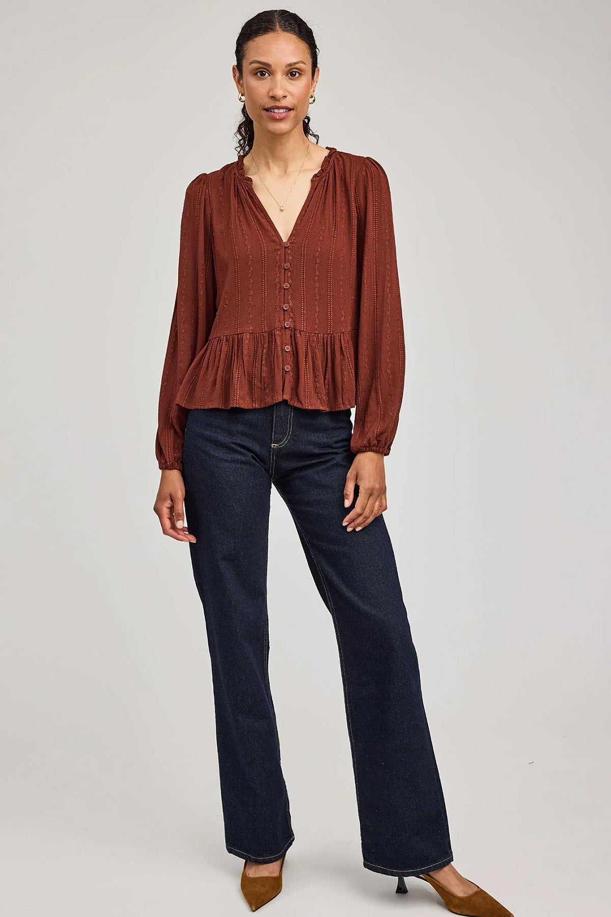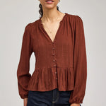 The Ophelia long sleeve blouse in mahogany features a textured fabric and a peplum hem for a feminine, flattering shape. Its rich color and elegant design make it a stylish choice for both Fall day and evening looks.