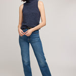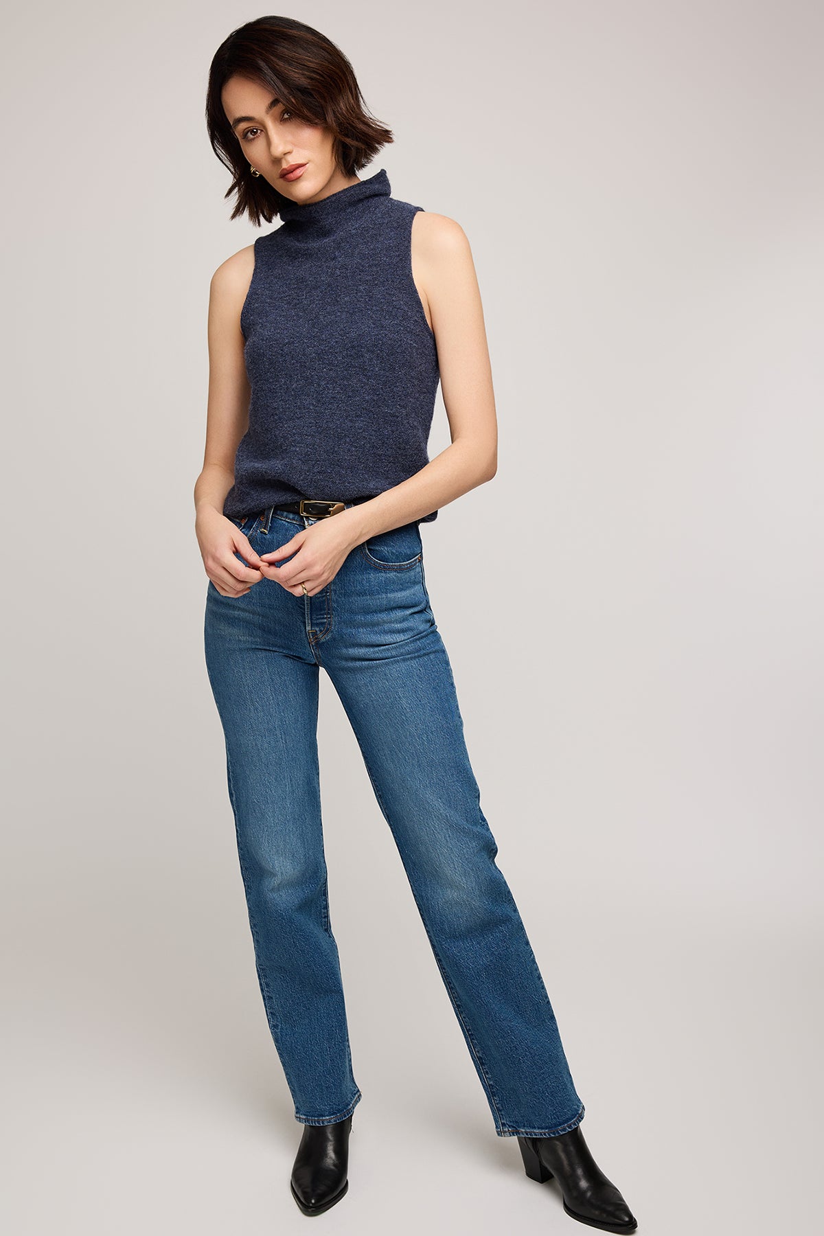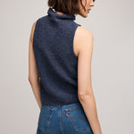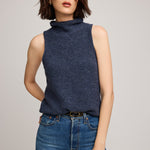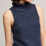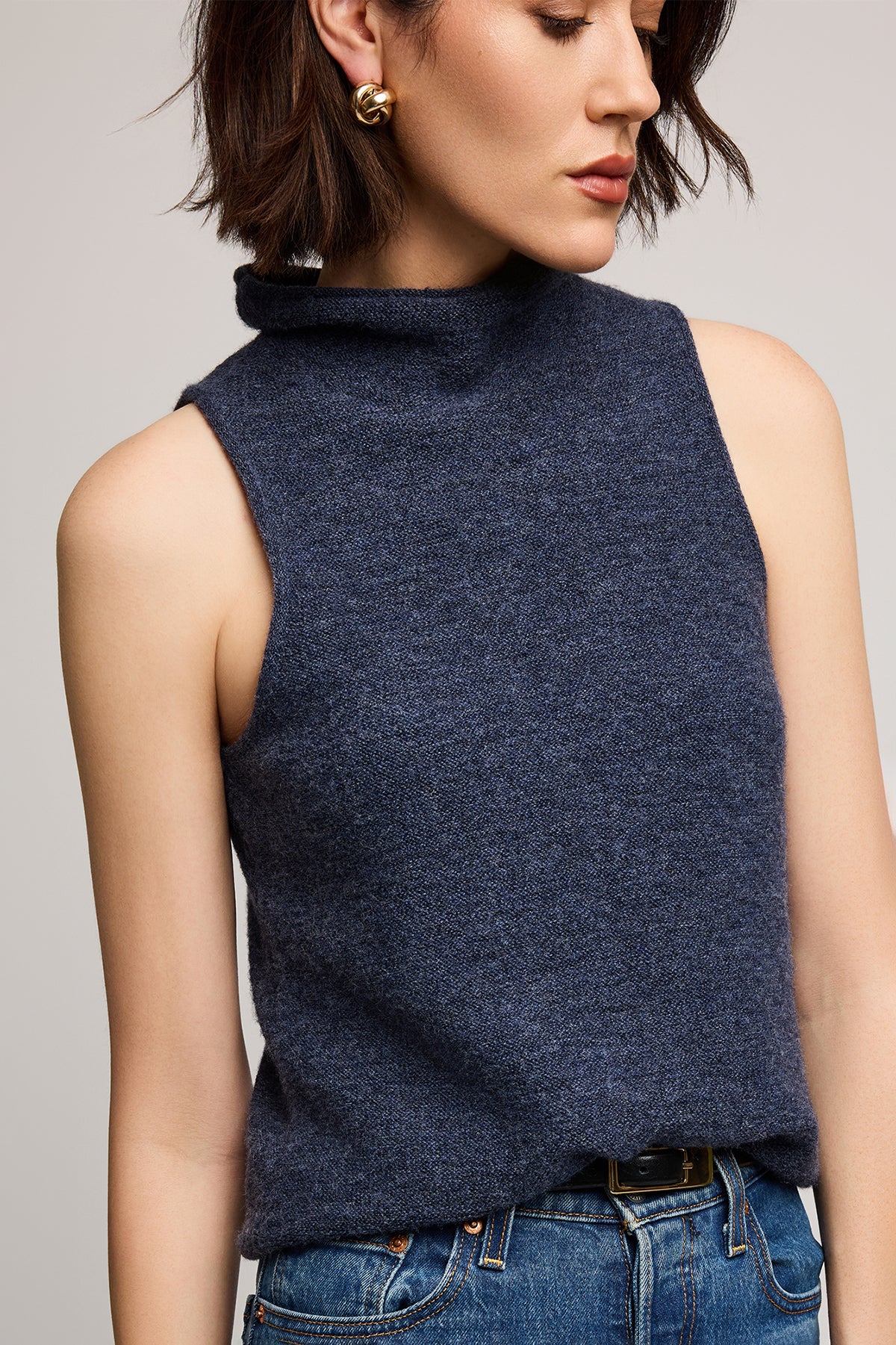 The Orla sweater is a sleeveless turtleneck featuring a chic rolled hem, combining sleek design with modern edge for a stylish and versatile layering piece.