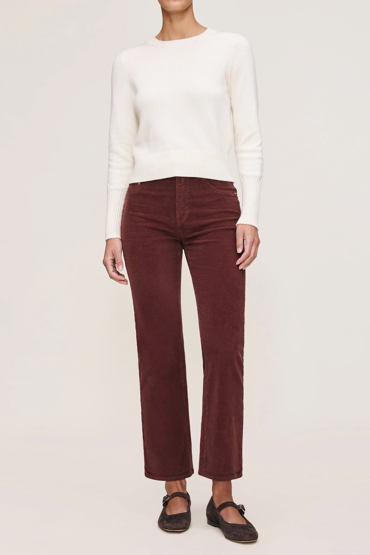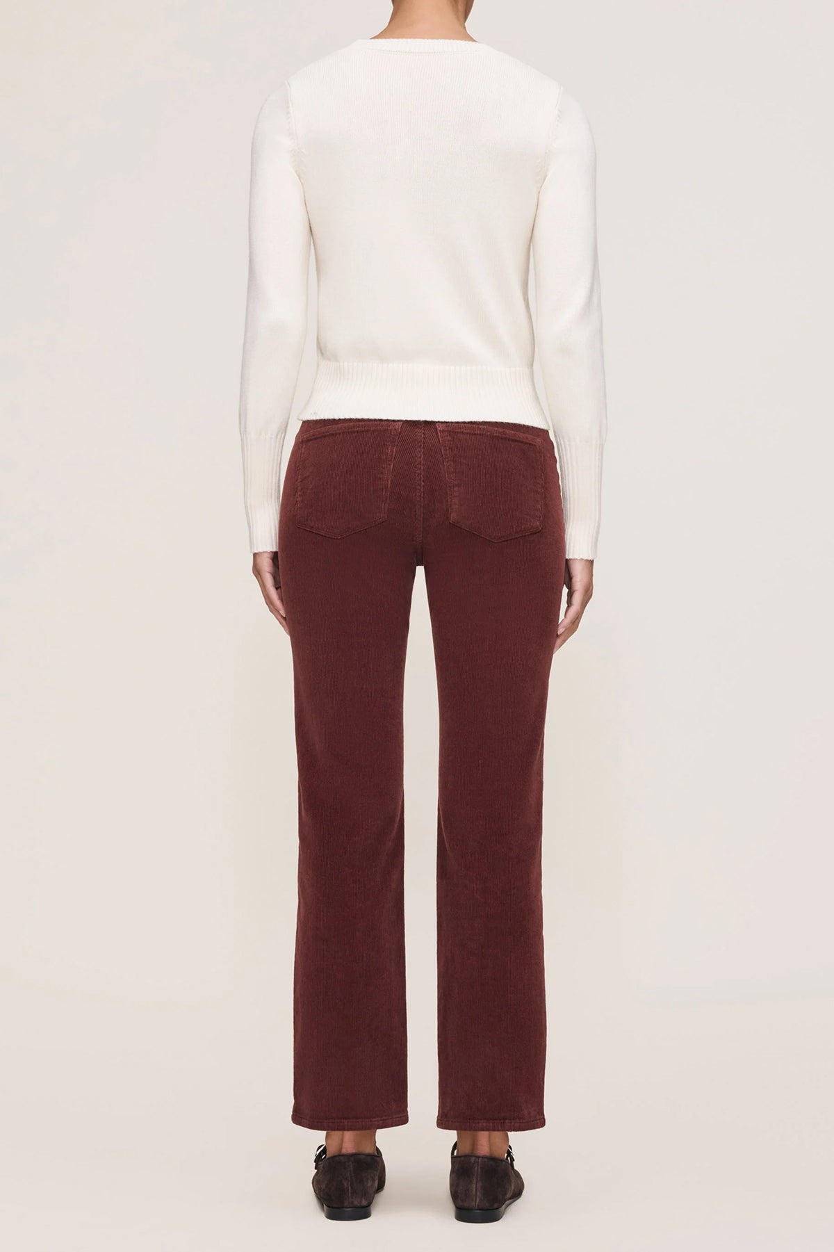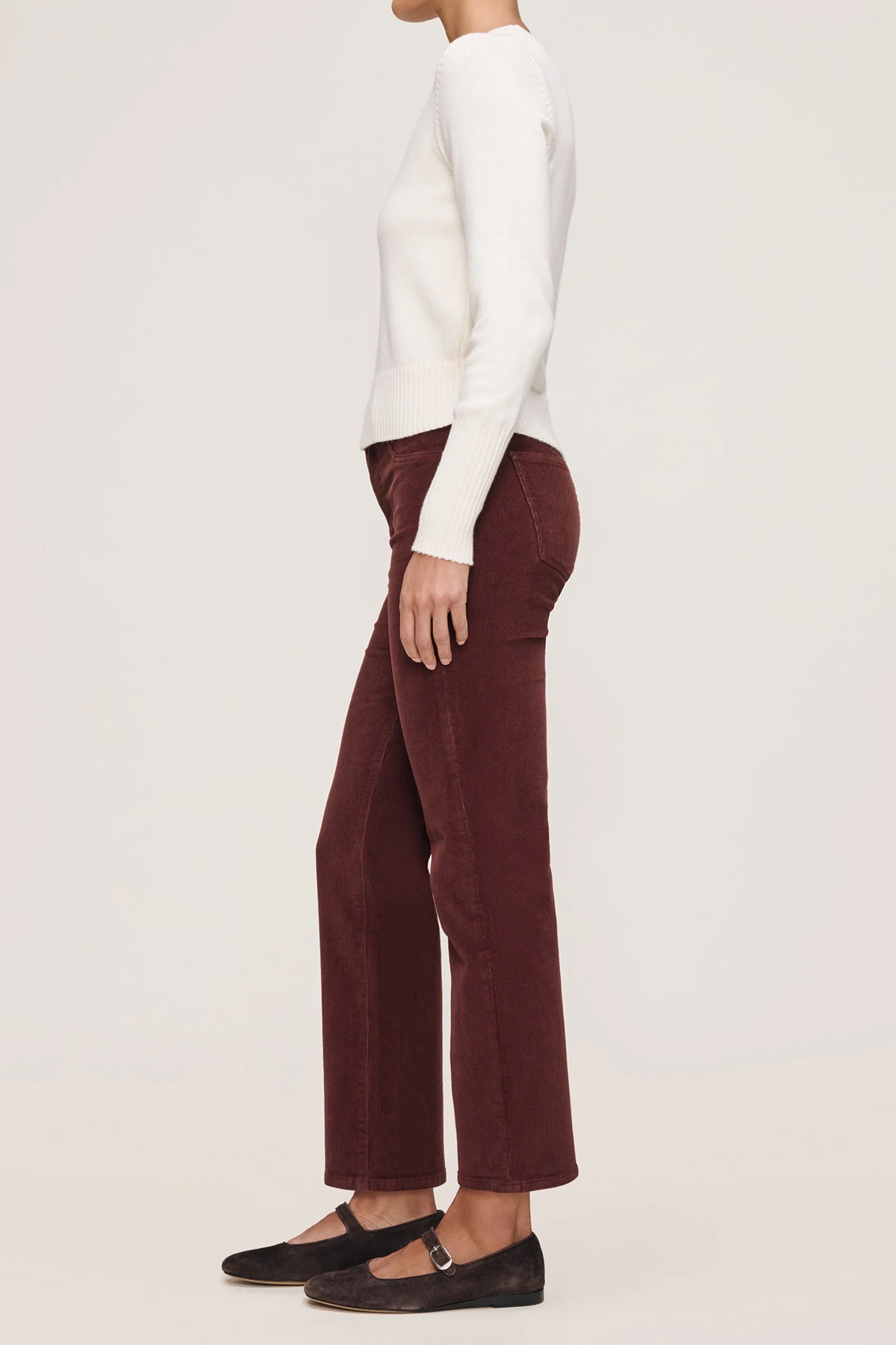 The Patti Straight brings together vintage-inspired style and everyday wearability in a high-rise silhouette. Cut with a relaxed fit through the leg at 27", this ankle-length design showcases Syrah, a sophisticated muted red corduroy with subtle plum notes. Polished with silver hardware, tonal stitching, a clean hem, and black back patch detailing.