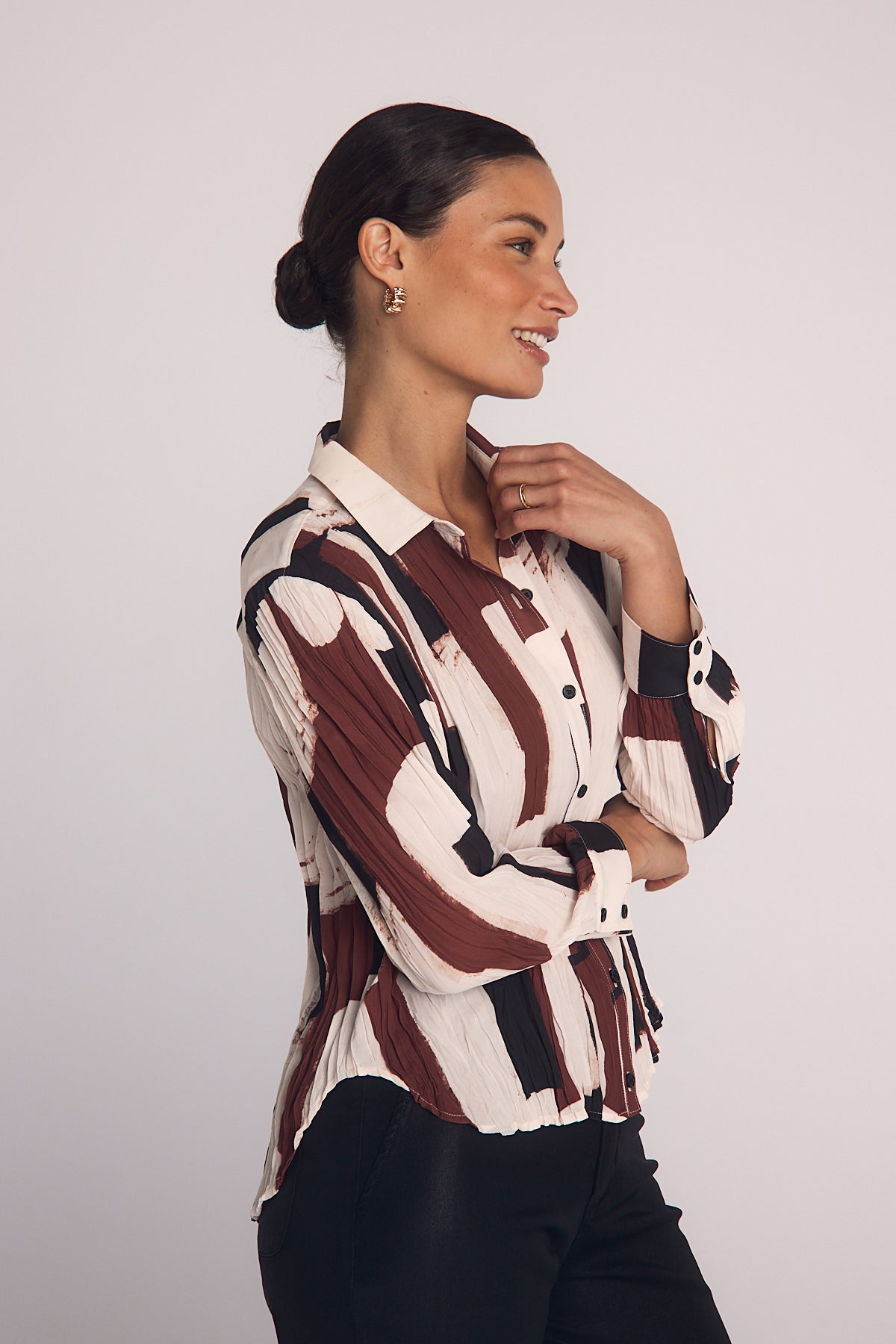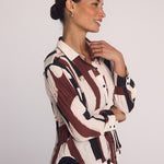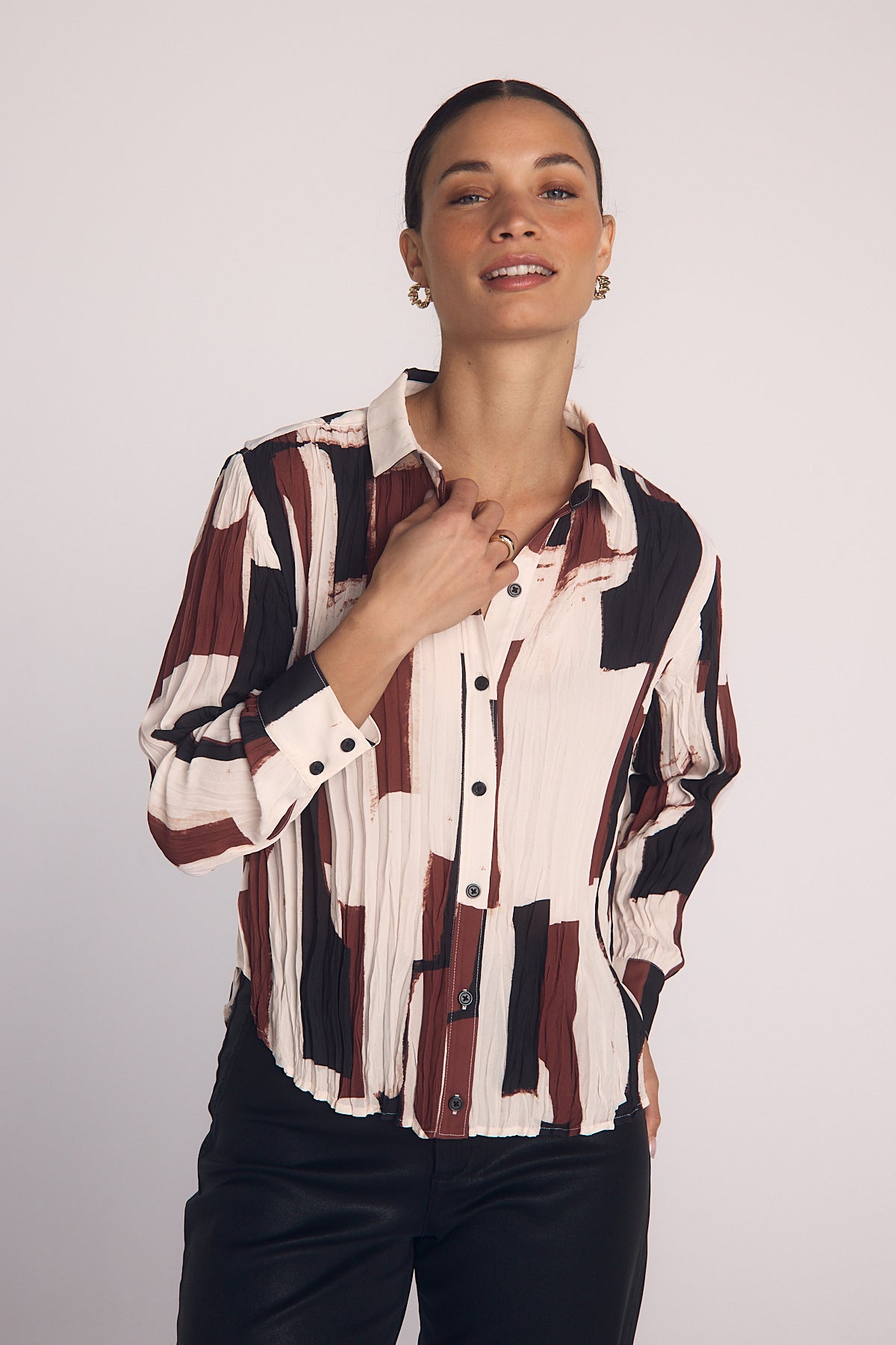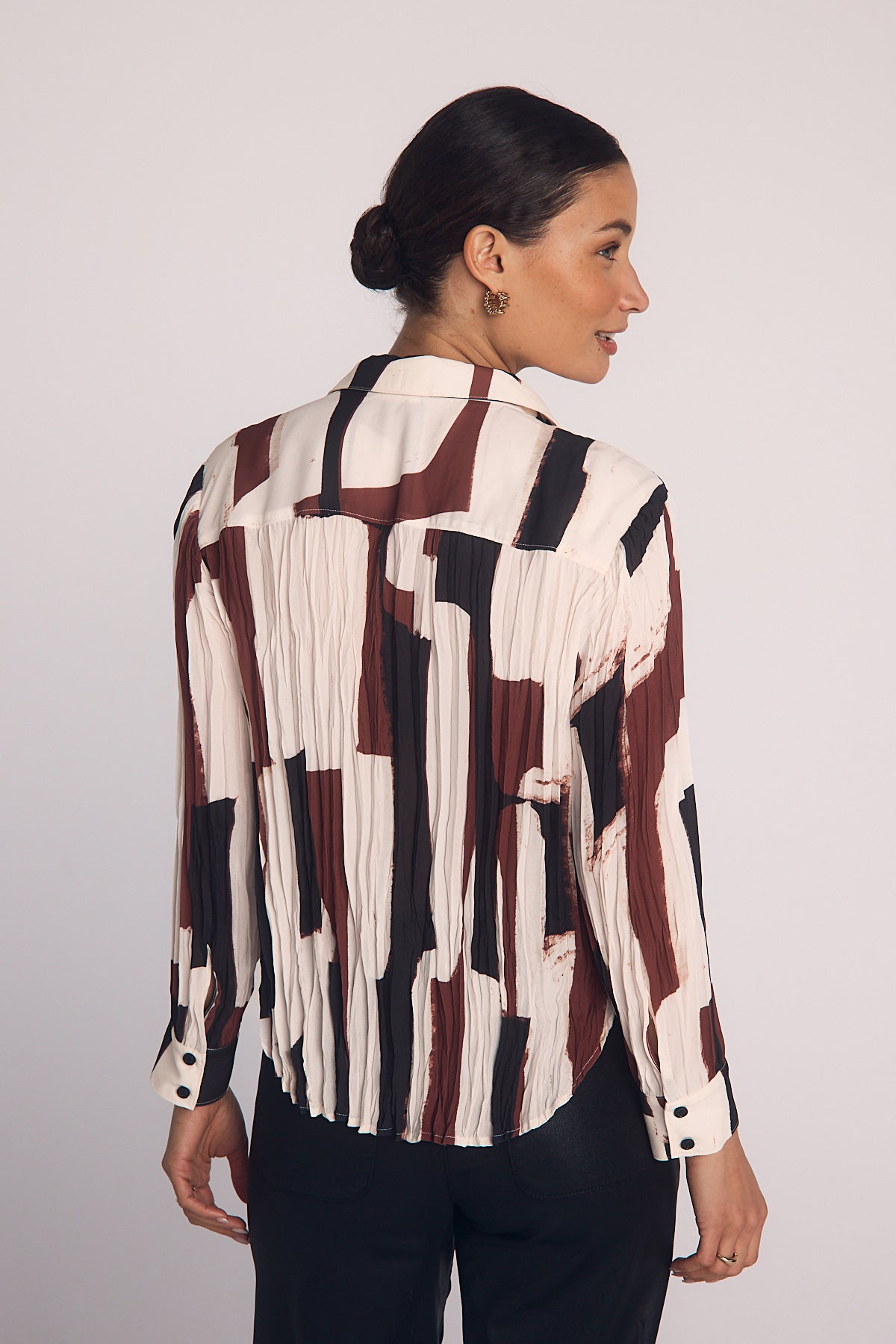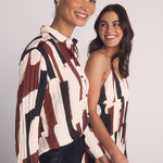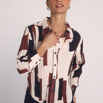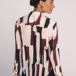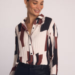 The Pleated Button Down combines a modern art print with pleated details for a stylish, fresh take on a classic shirt.