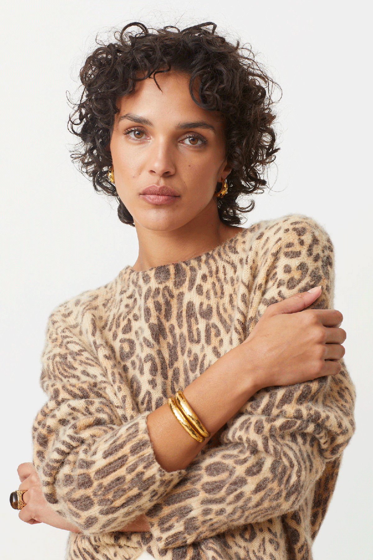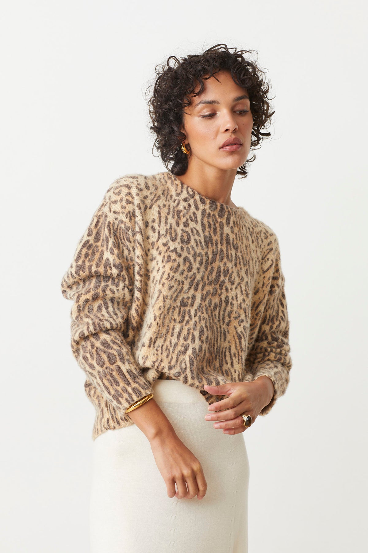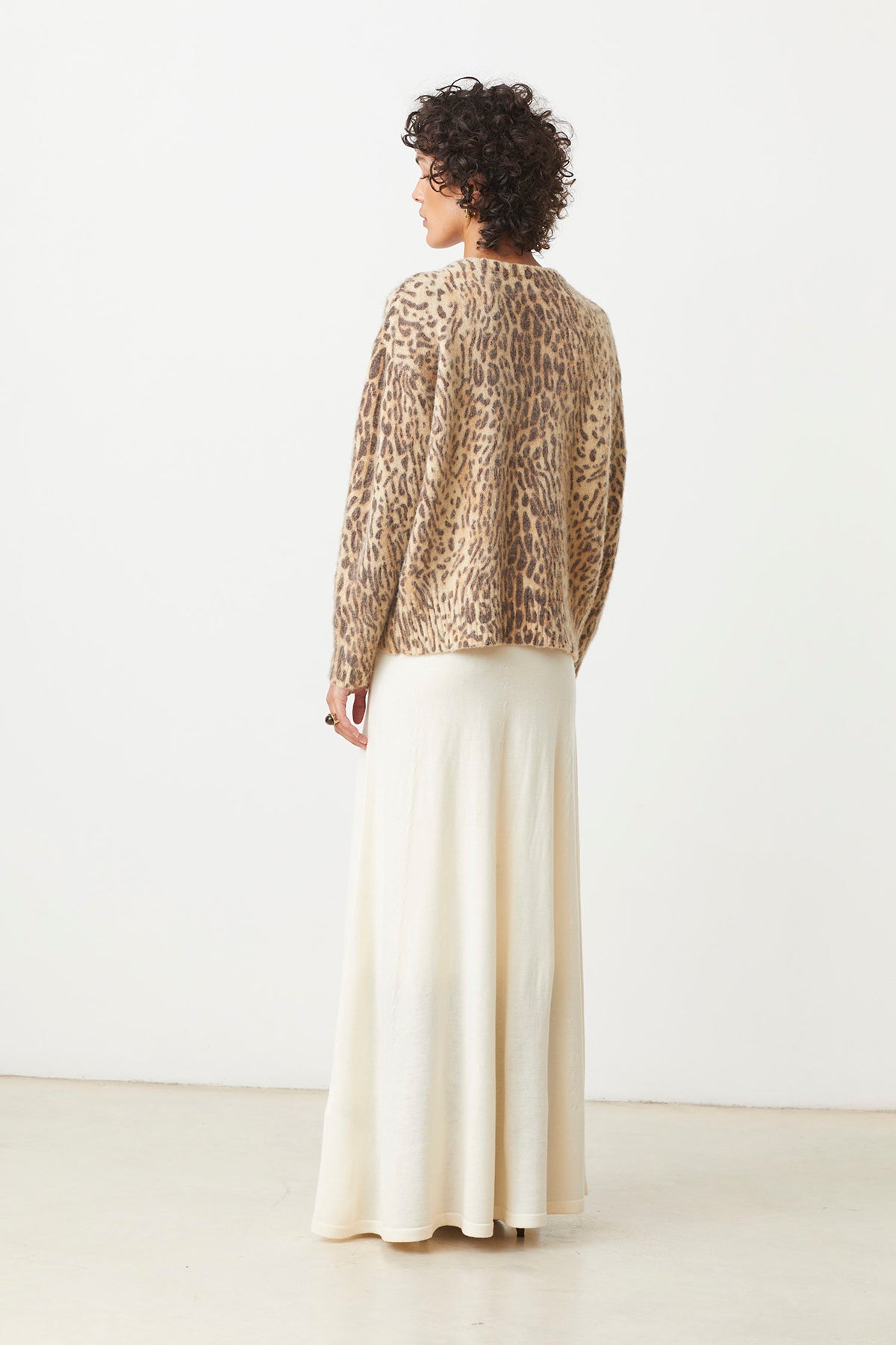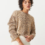 The Pleoli Sweater features a beige base with a bold leopard print, combining classic animal patterns with a soft, neutral tone for a stylish and eye-catching look.