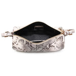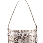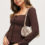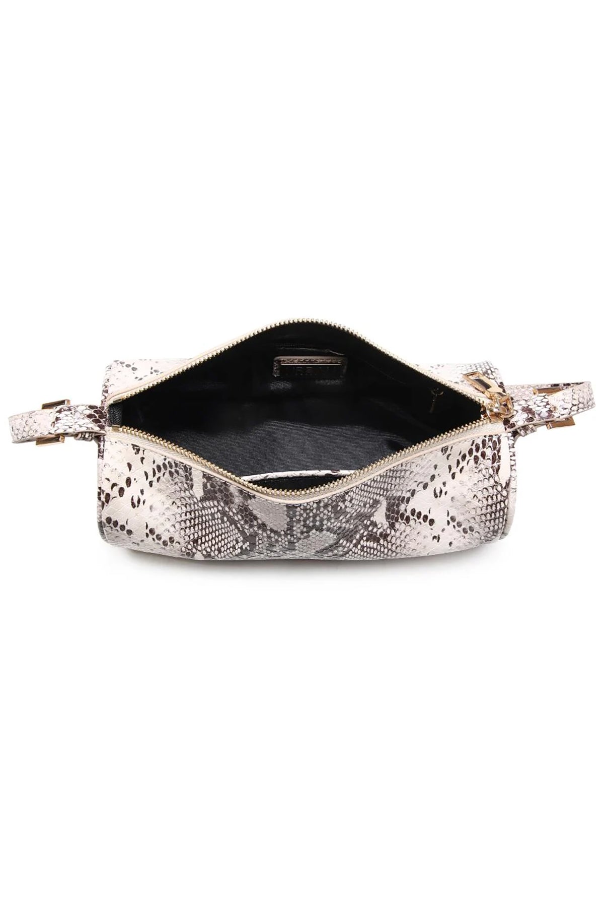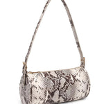 The Rachel Shoulder Bag has a cylinder shape and snake print, adding bold style to any look.