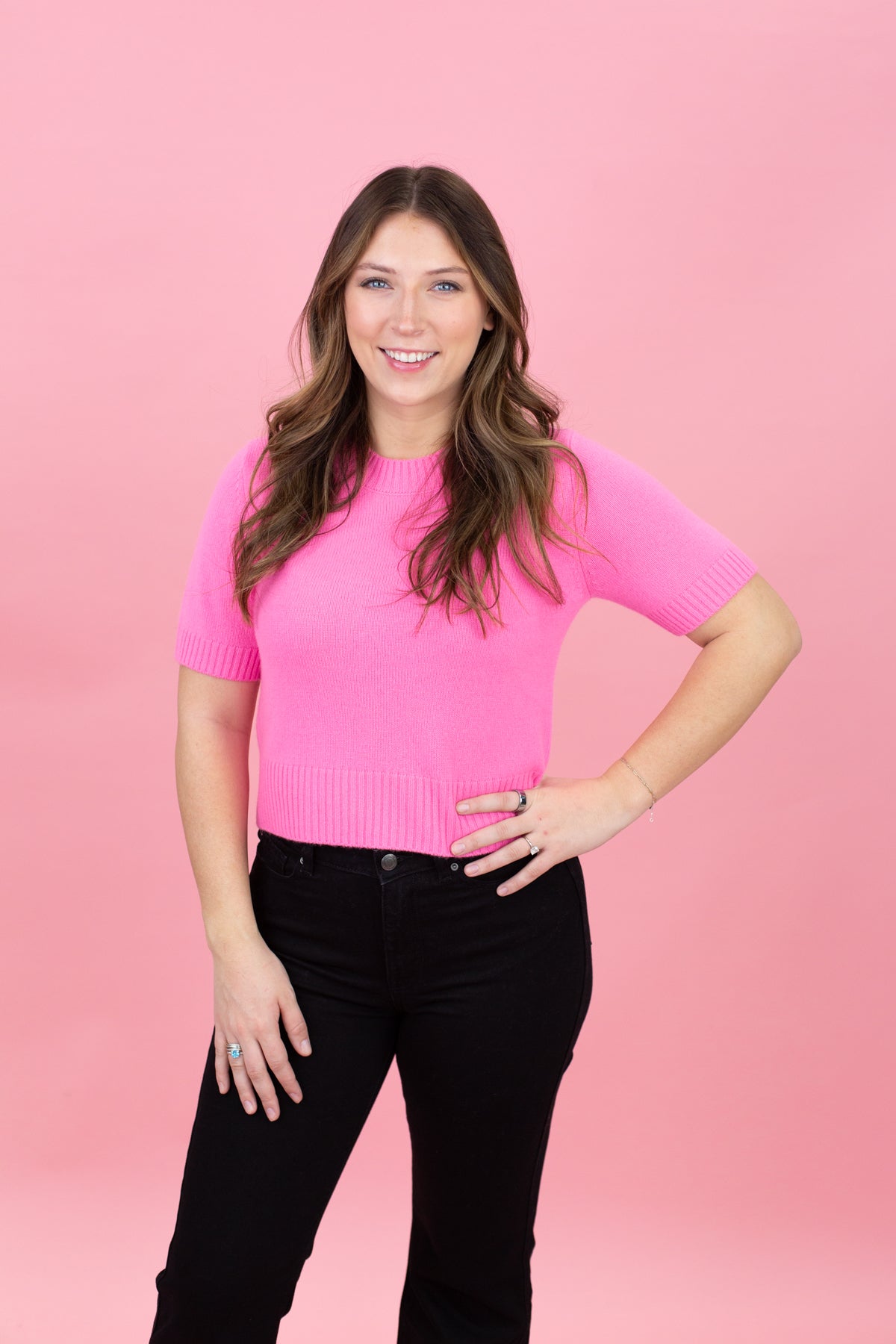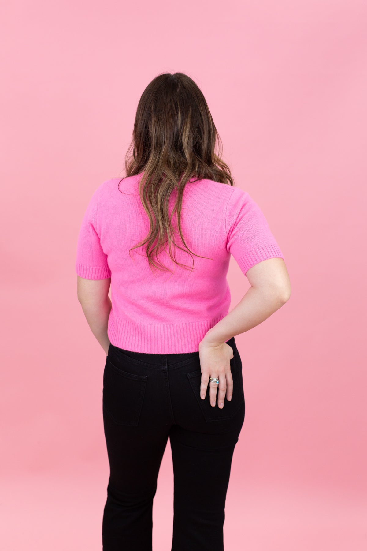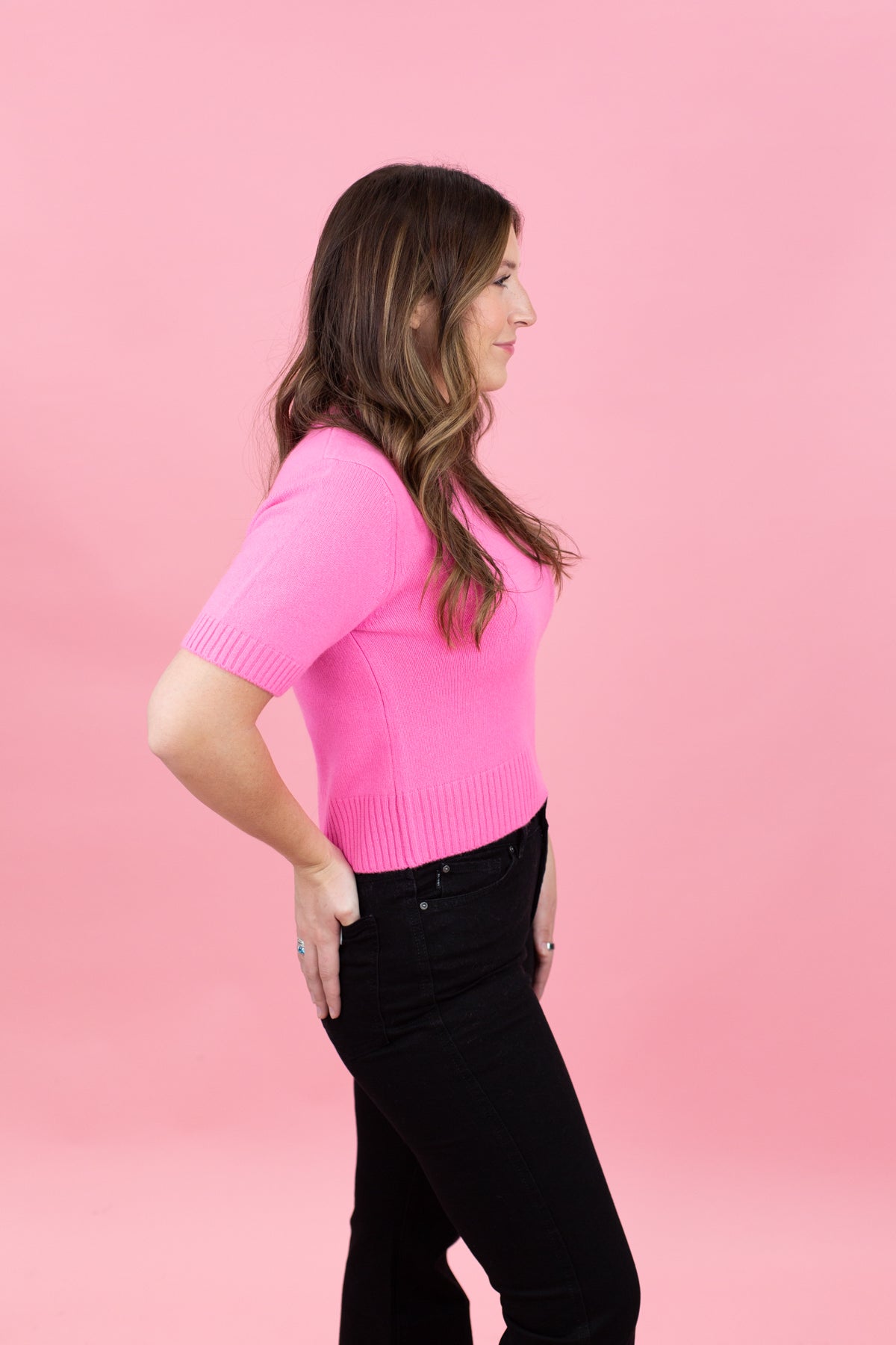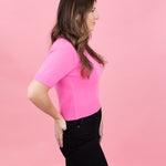 The Remi Tee is a short-sleeve cashmere sweater in Barbie pink. Made from 100% pure cashmere, it's soft, breathable, and versatile enough to wear alone or layered. A timeless wardrobe staple!