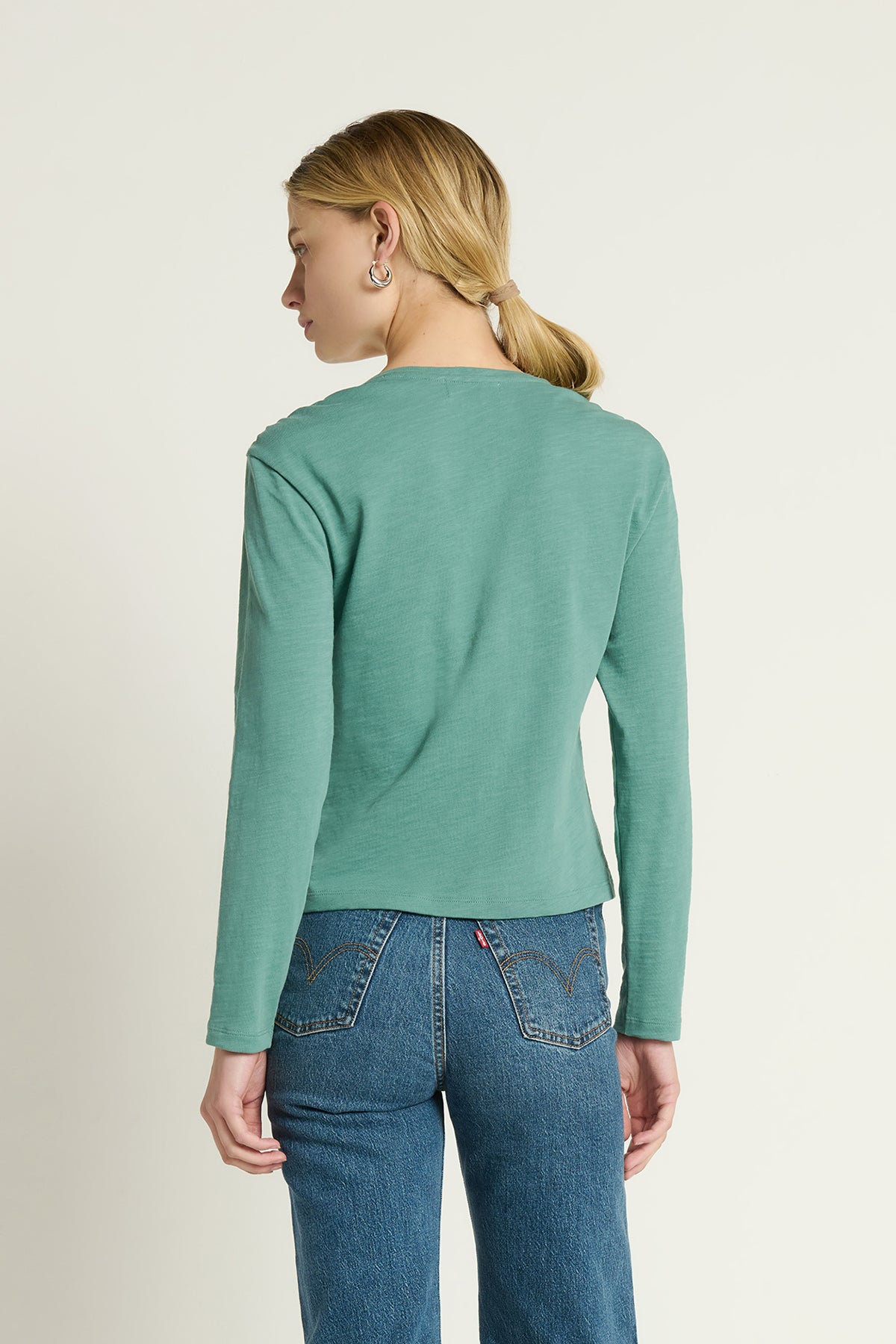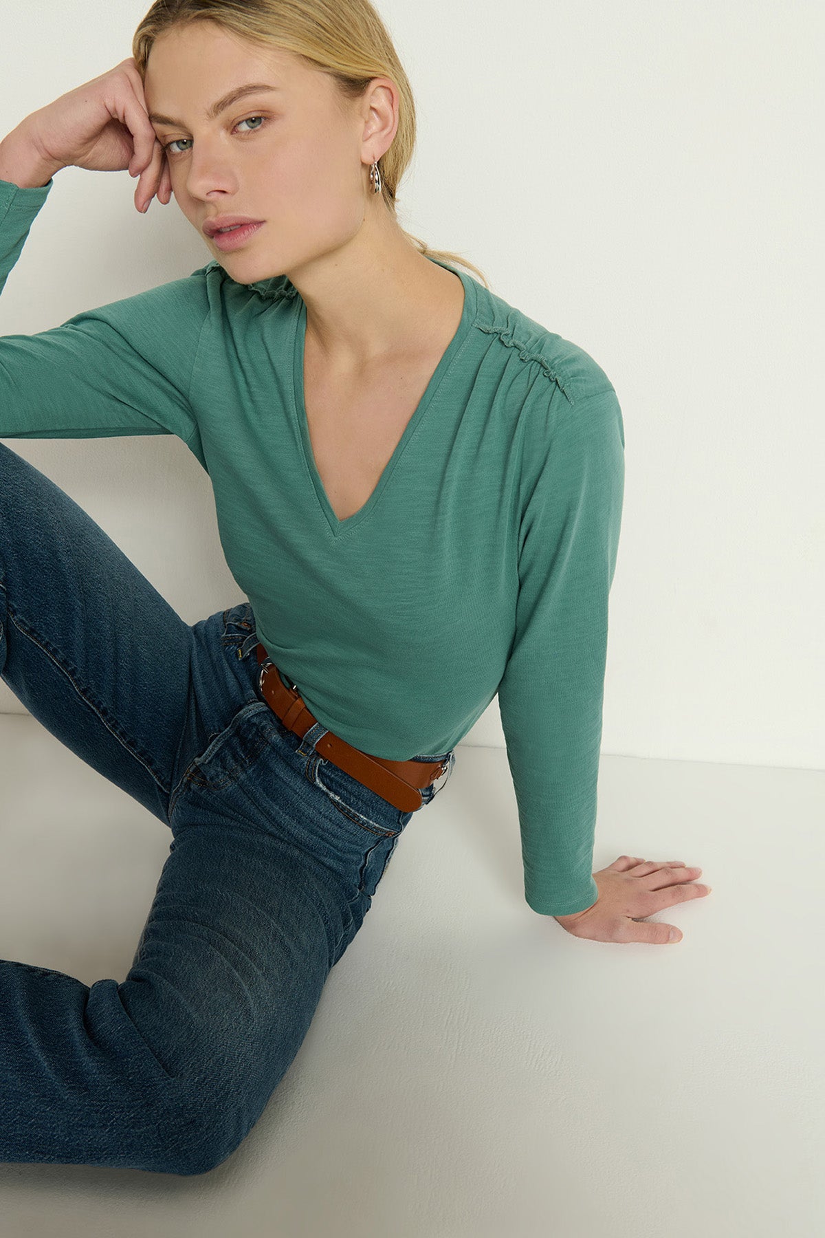 The Remi V-Neck Top in Sagebrush is made from soft cotton with long sleeves and a flattering v-neck, offering comfortable and versatile style.