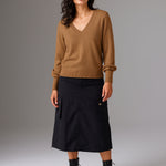 The Ria Elegant V sweater has a V-neck and comes in a warm camel color. It’s cozy and stylish, great for layering or wearing alone.