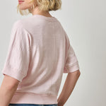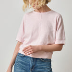 A versatile petal pink essential featuring refined rib trim detailing and comfortable short sleeves. Layer it, pair it with denim or skirts, or wear it solo—this timeless top adapts to any occasion with understated and effortless ease.