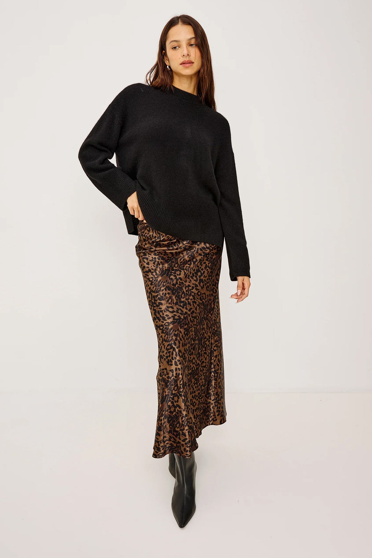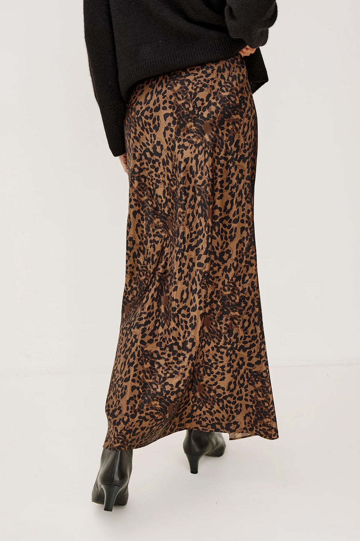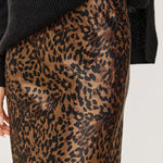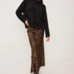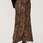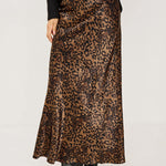 The Romina maxi skirt features a bold leopard print on silky fabric with an elegant flowing length. Style it with fitted tops or pair with the Jazlyn blouse for a coordinated look.
