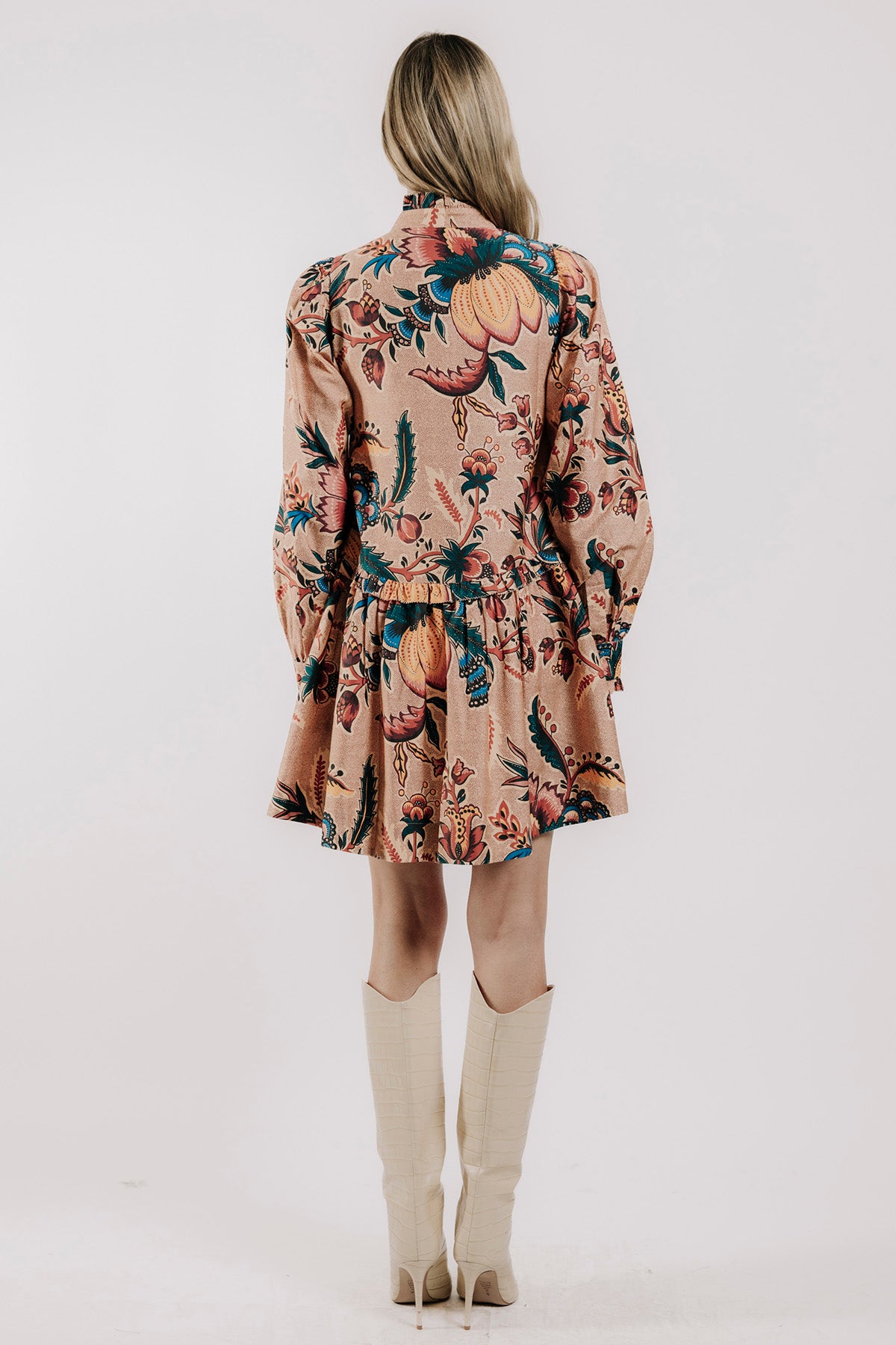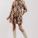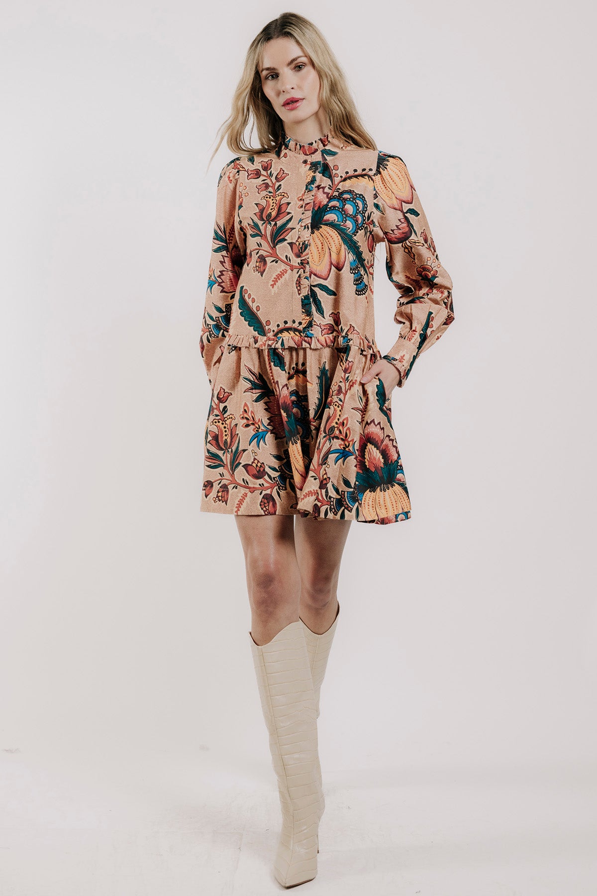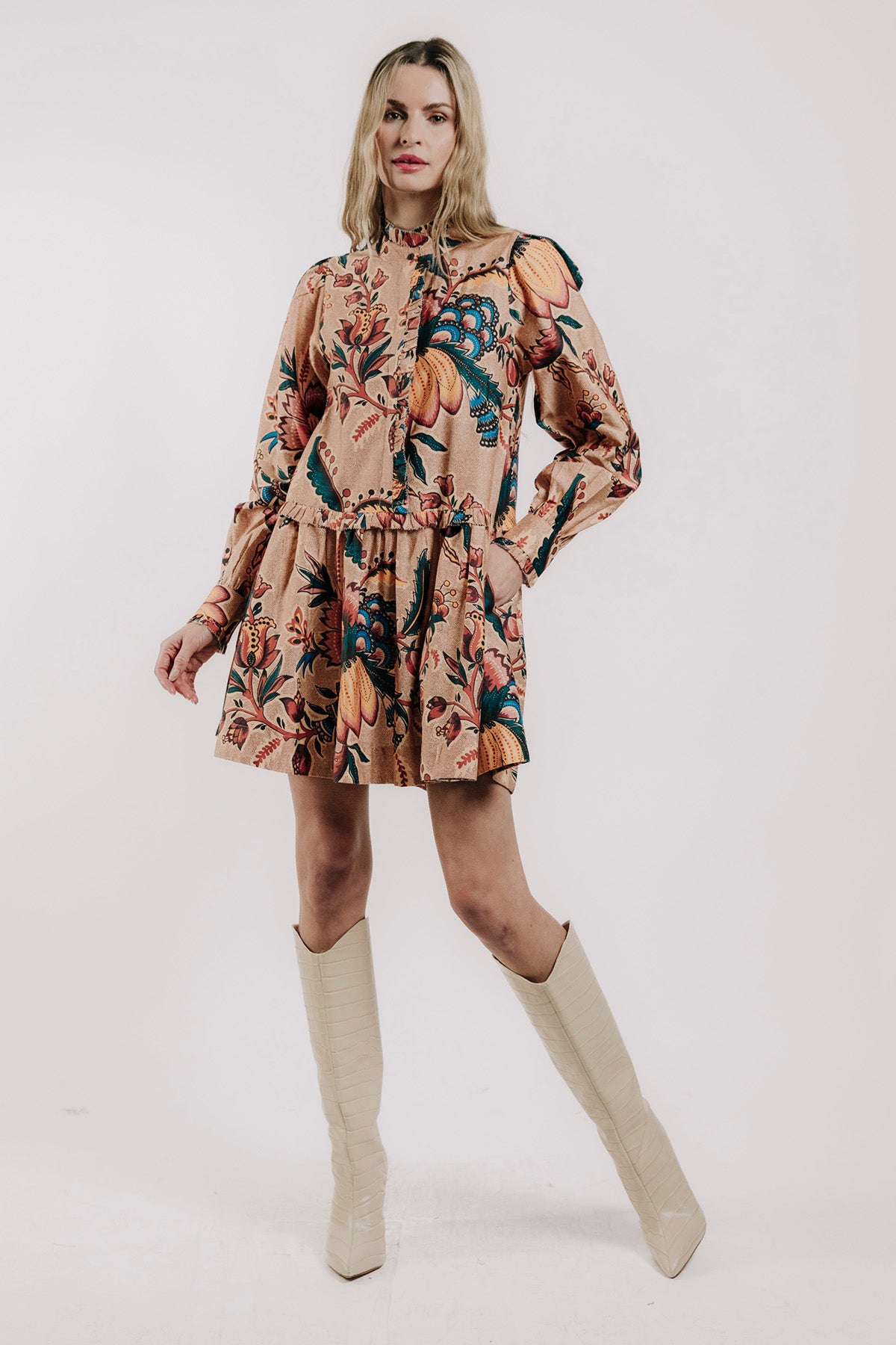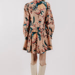 The Rubith Mini Dress has long sleeves and pockets, styled with a bold aster harvest print for a chic, effortless look.