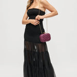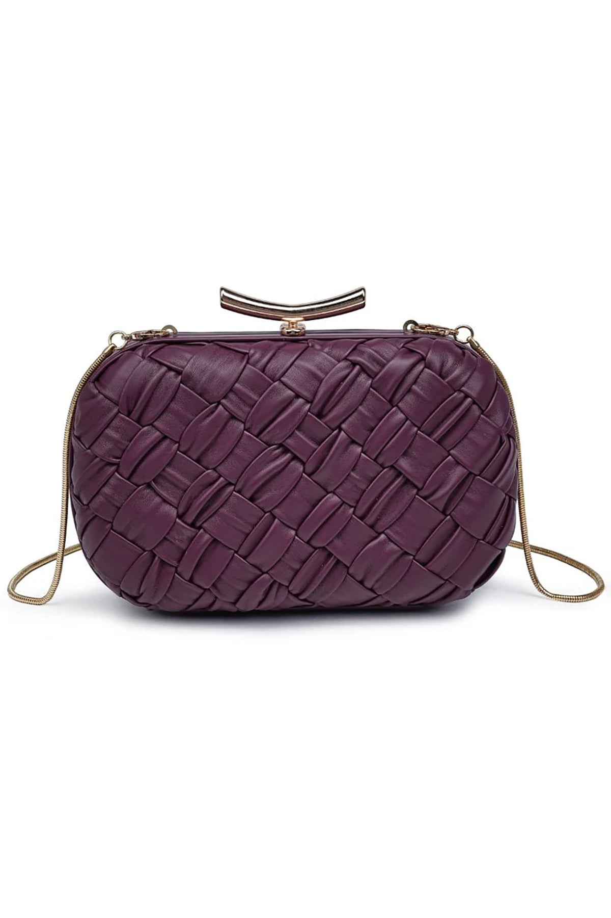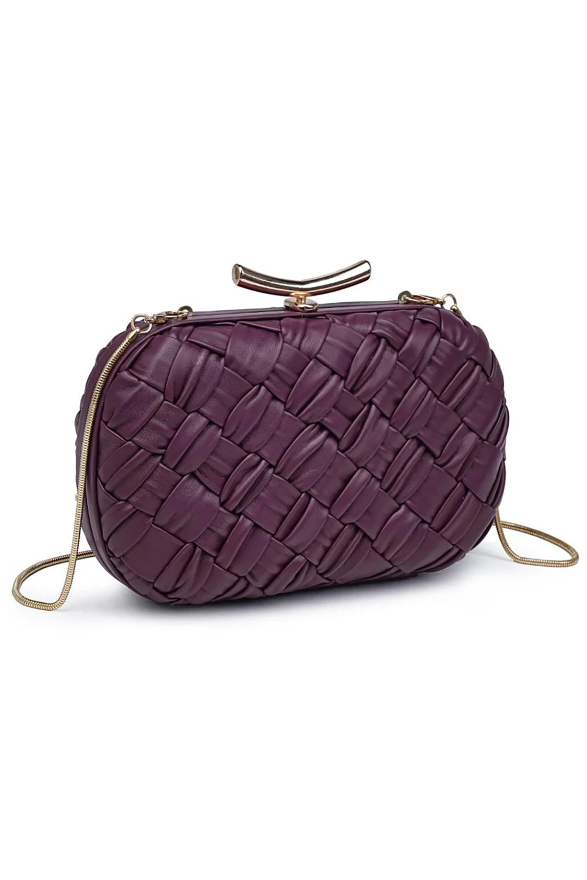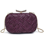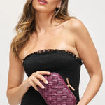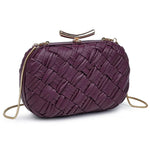 The Rya Evening Bag showcases a deep burgundy woven design, perfect for adding a touch of elegance to any evening look. Its compact clutch style combines refined texture with rich color, making it an ideal accessory for special occasions.