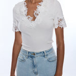 The Shiloh 3D Lace Combo Top brings texture and dimension to a modern silhouette. Intricate lace detailing adds depth and visual interest while maintaining an elegant, feminine feel. The structured yet soft design makes it perfect for both polished and casual styling.