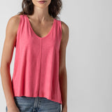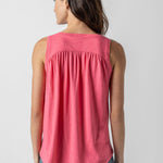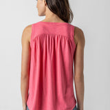 Stylish V-neck tank featuring textured shirred back detail. Versatile design perfect for both layering and standalone wear, easily transitioning from day to night summer wear!
