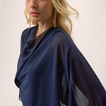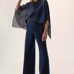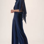The Silky Knit Wide Leg Jumpsuit with chiffon overlay offers a comfortable, flowing fit perfect for any elevated occasion.