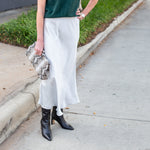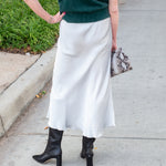 The Silky Slip Skirt in silver features smooth, lightweight fabric that flows beautifully. Its subtle shine adds style, making it easy to dress up or down for any occasion.