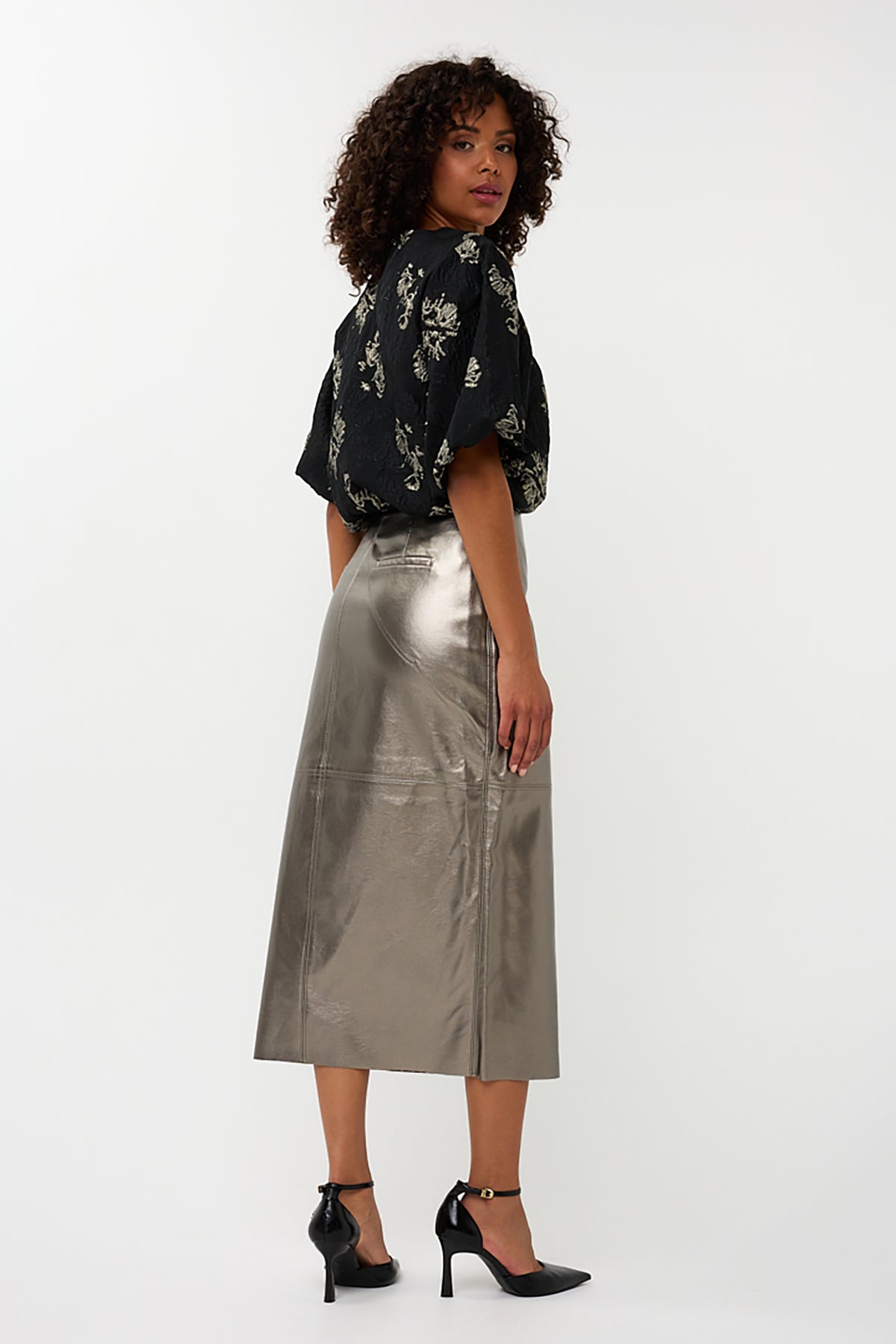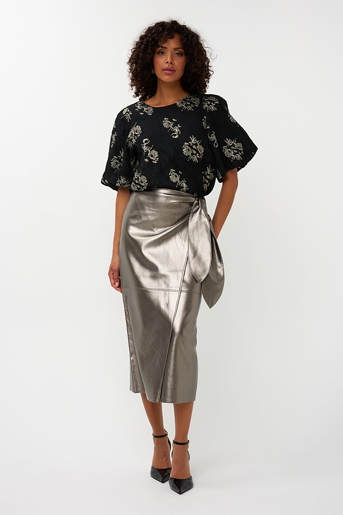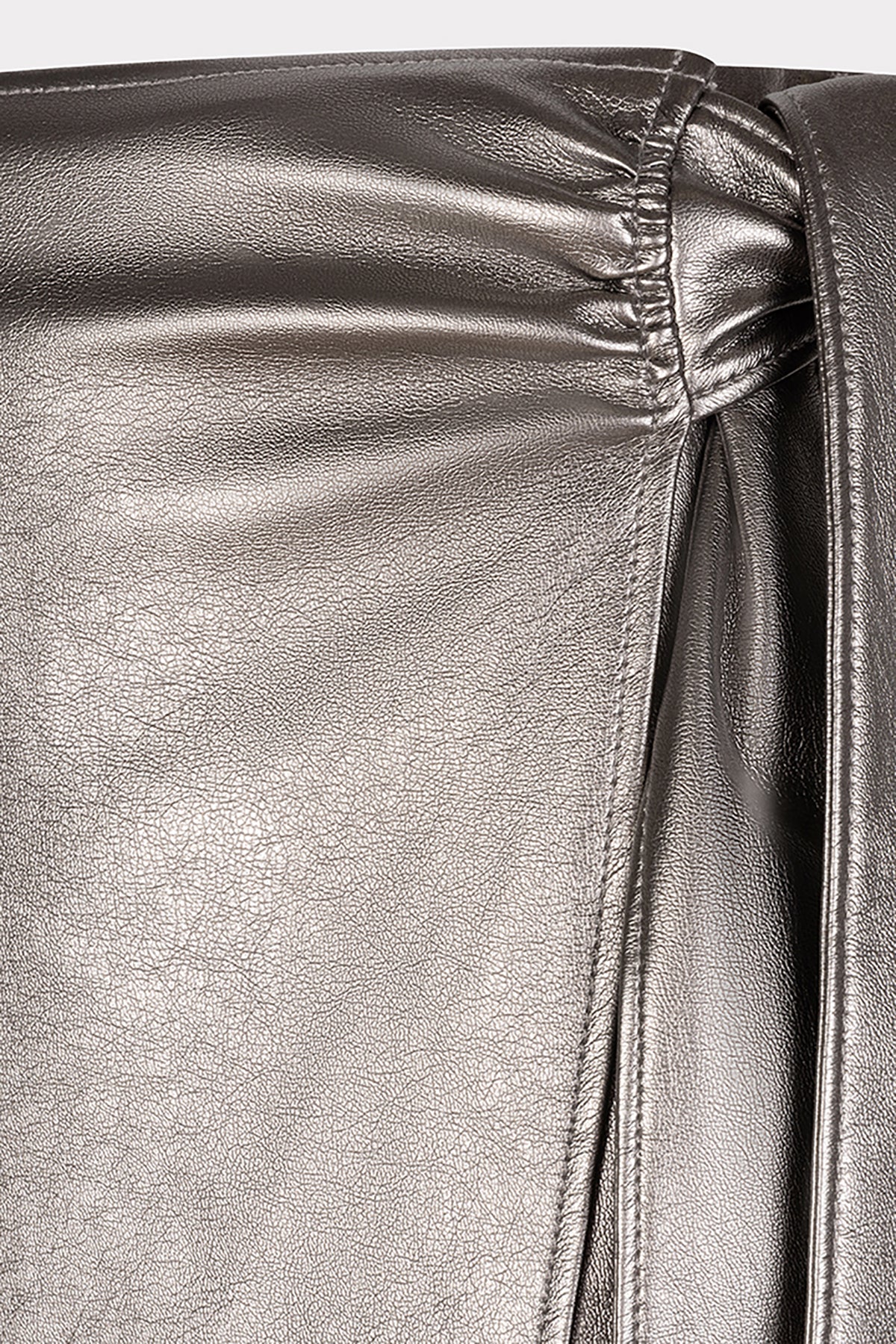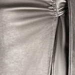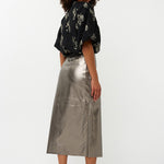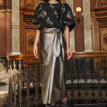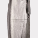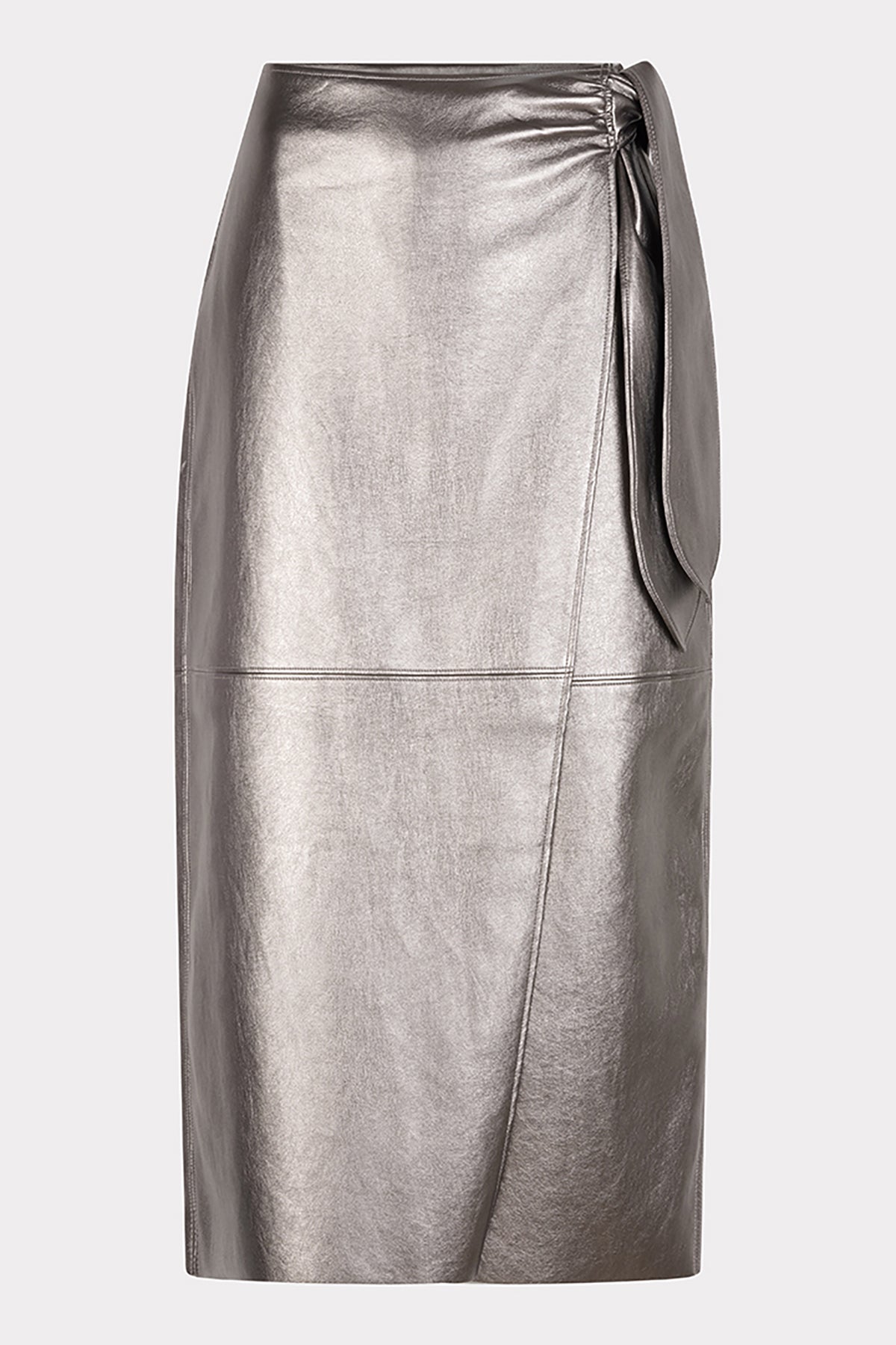 This silver leather midi skirt has a tie waist belt for a flattering fit and a shiny, stylish look.