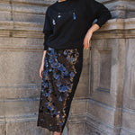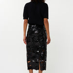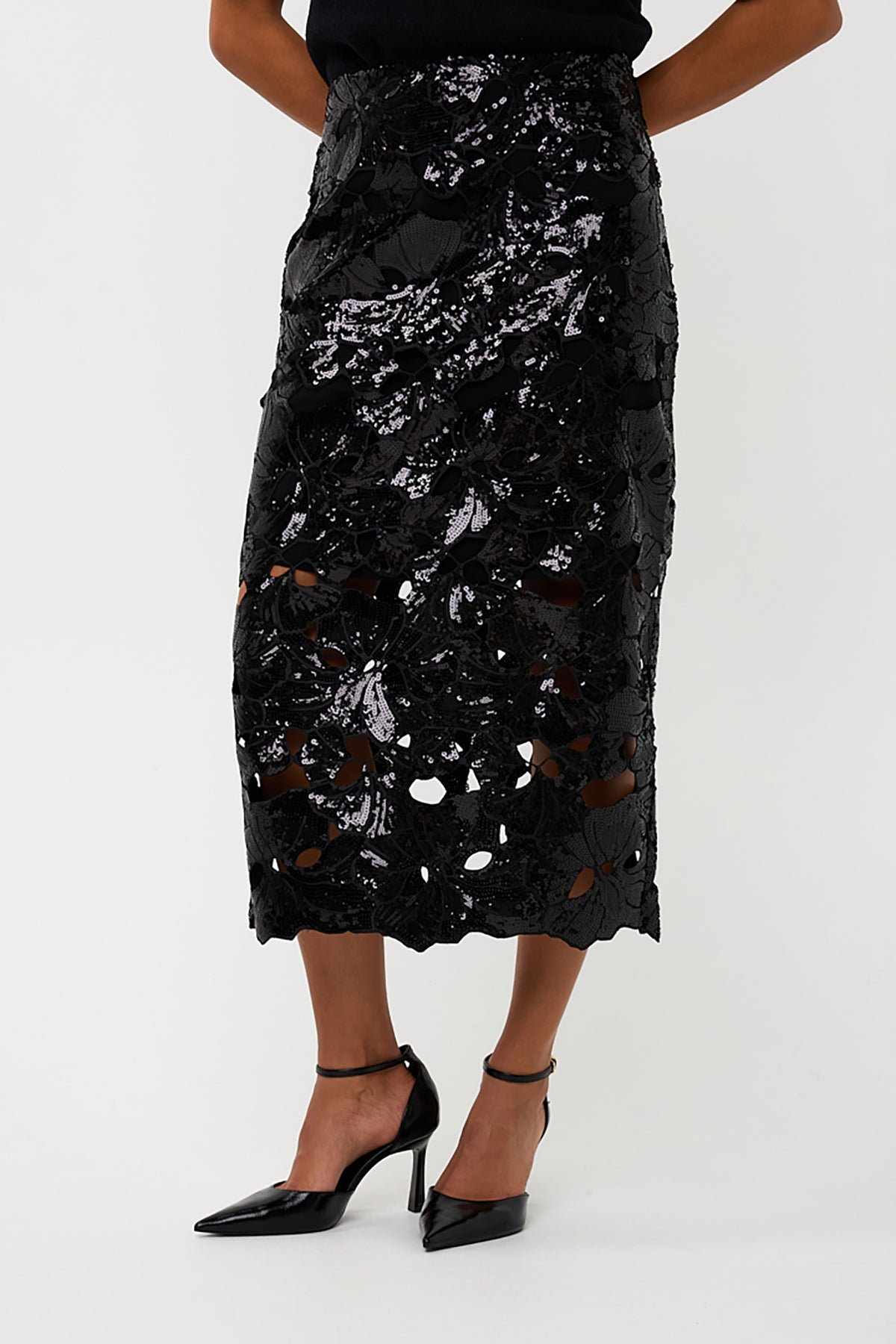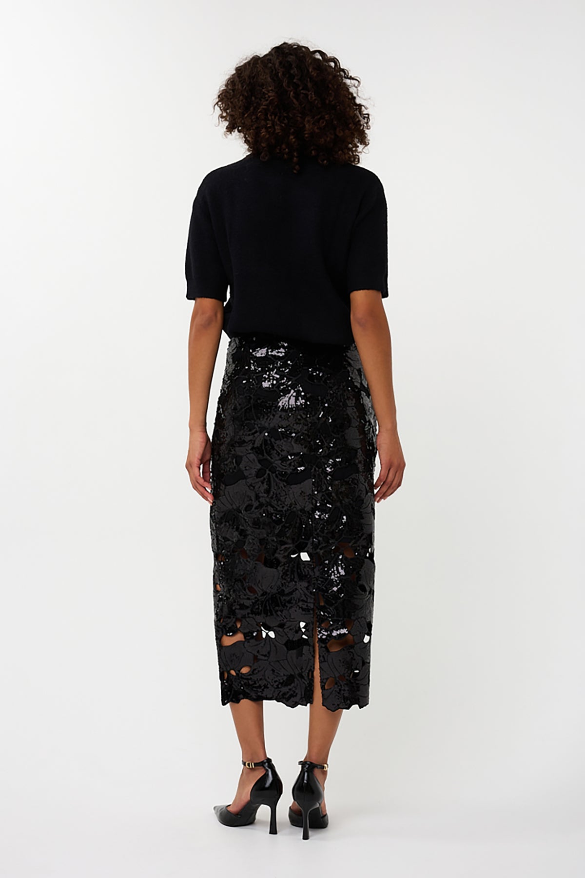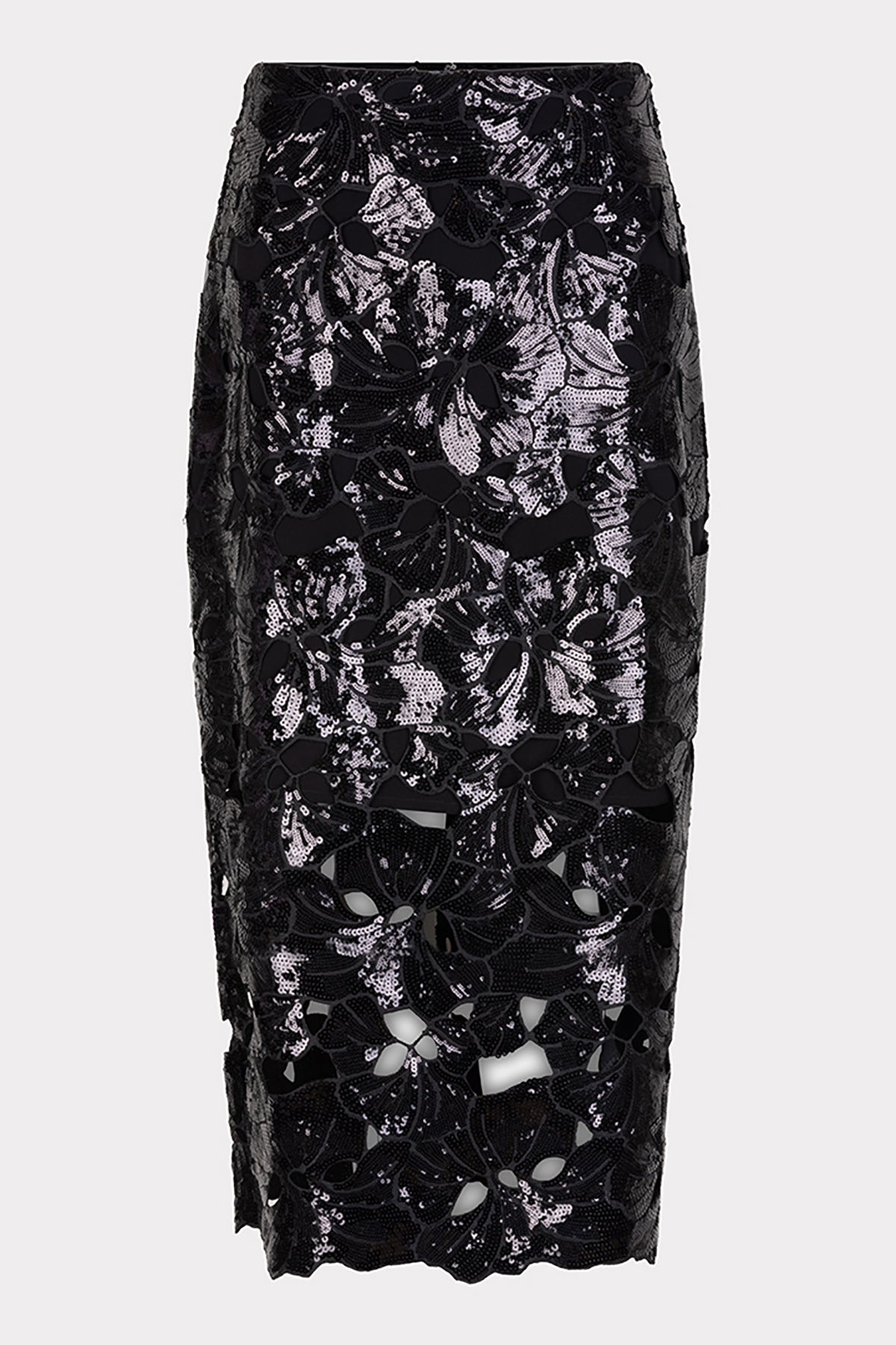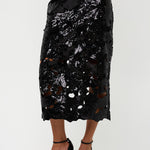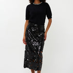 This sequin midi skirt adds sparkle and style to any outfit. Its flattering fit works well with casual or dressy tops, making it perfect for day or night looks.