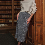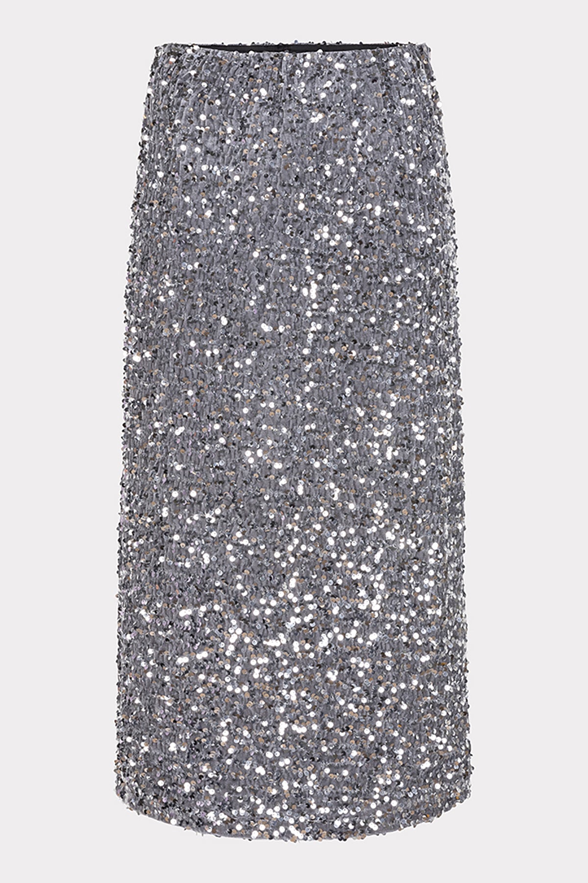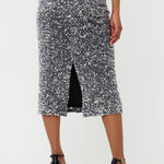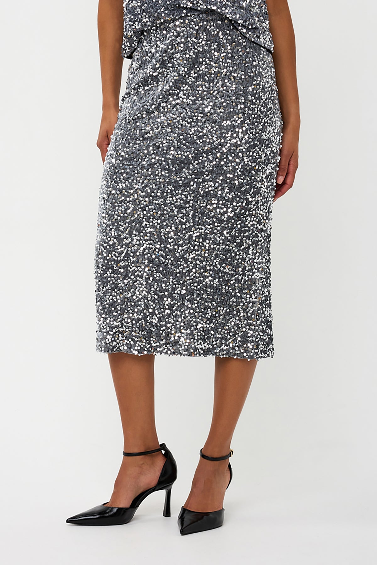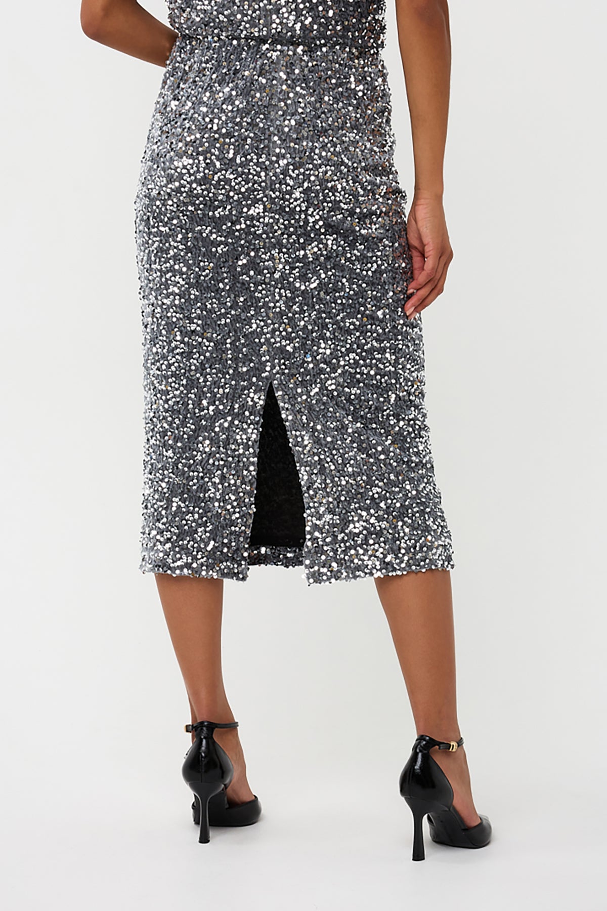 This silver sequin midi skirt shines with every step and offers a flattering fit. Ideal for parties or special occasions, it pairs well with its matching top!