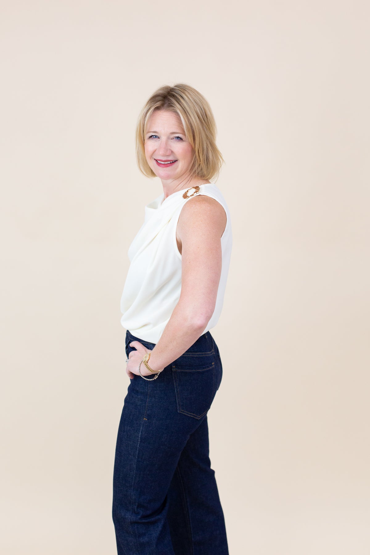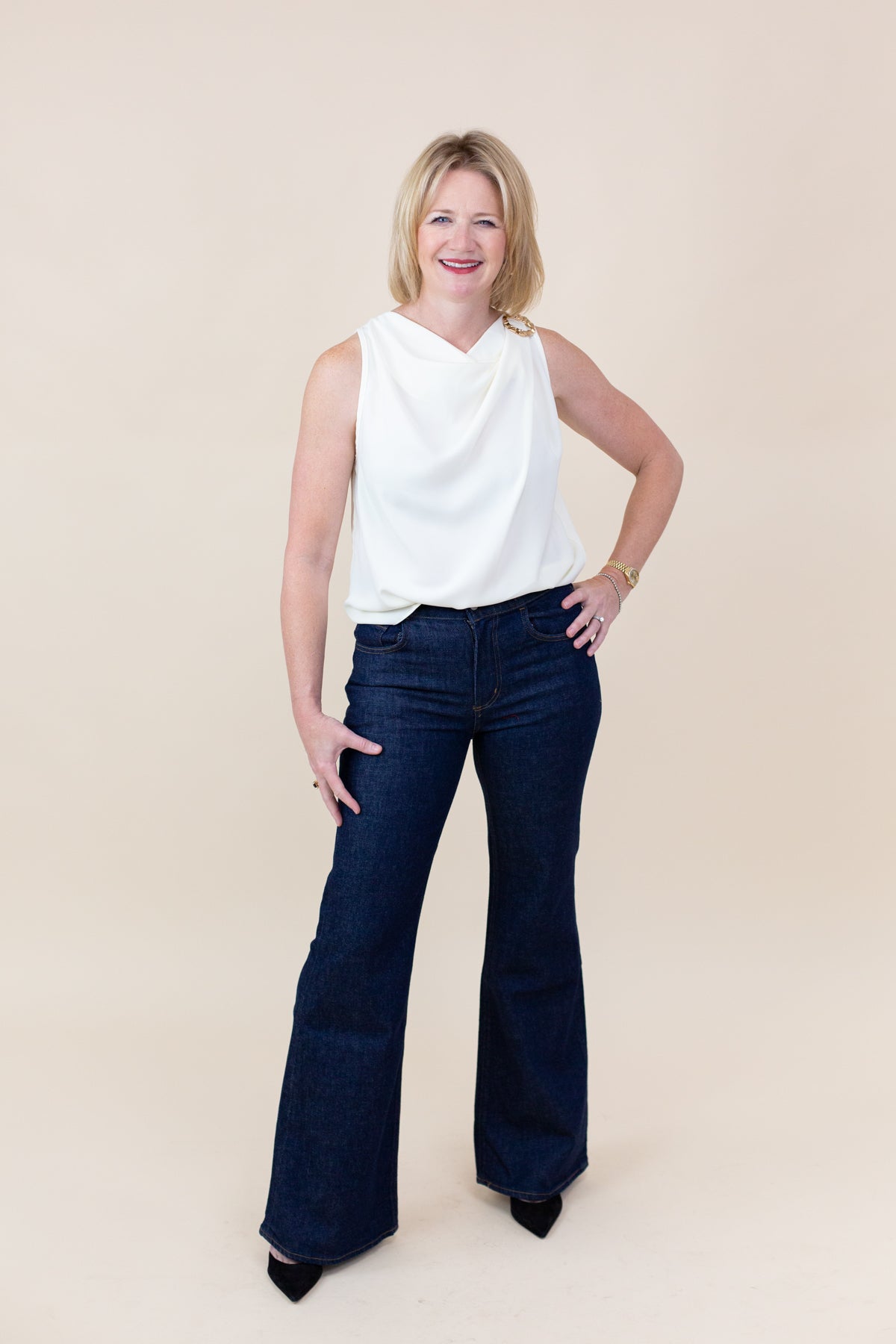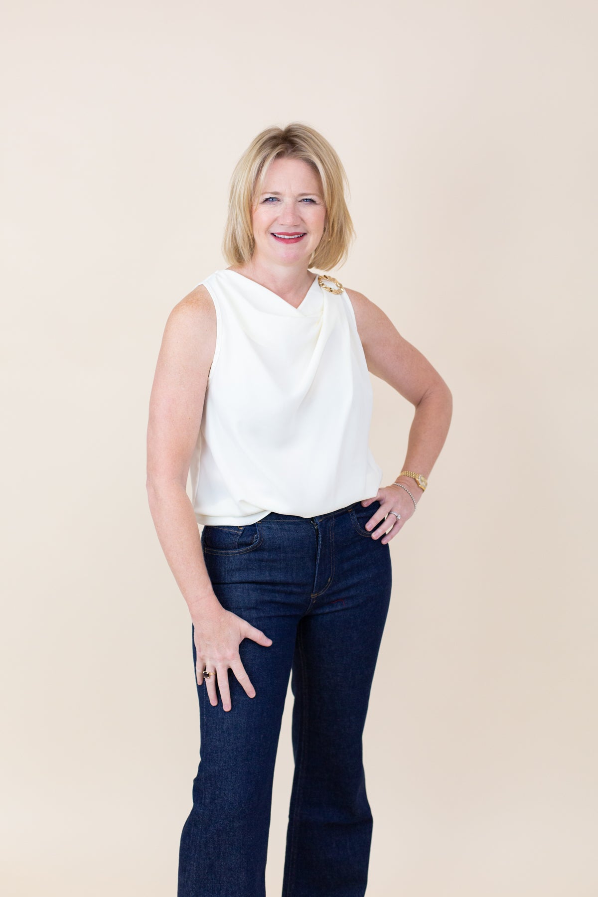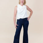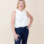 This sleeveless blouse features a stylish cowl neck and gold ring details. Its soft fabric creates a flattering fit, making it ideal for day-to-night wear.