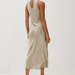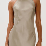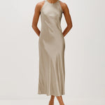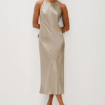 The Sloene Dress is a silky halter neck midi that offers a simple, elegant look. Its sleeveless design and smooth fabric make it perfect for both day and night occasions.