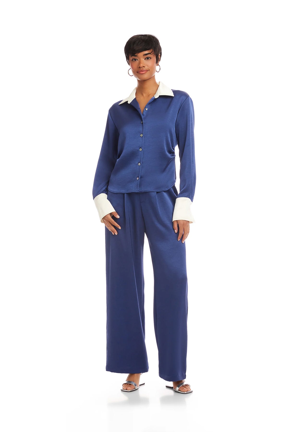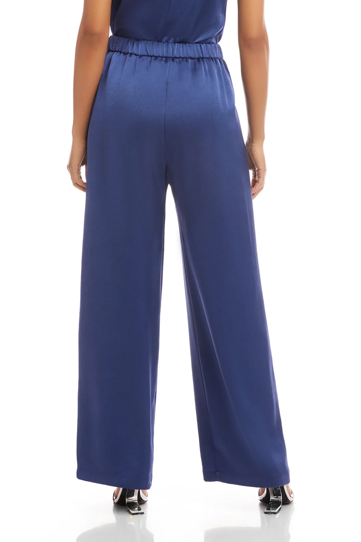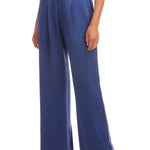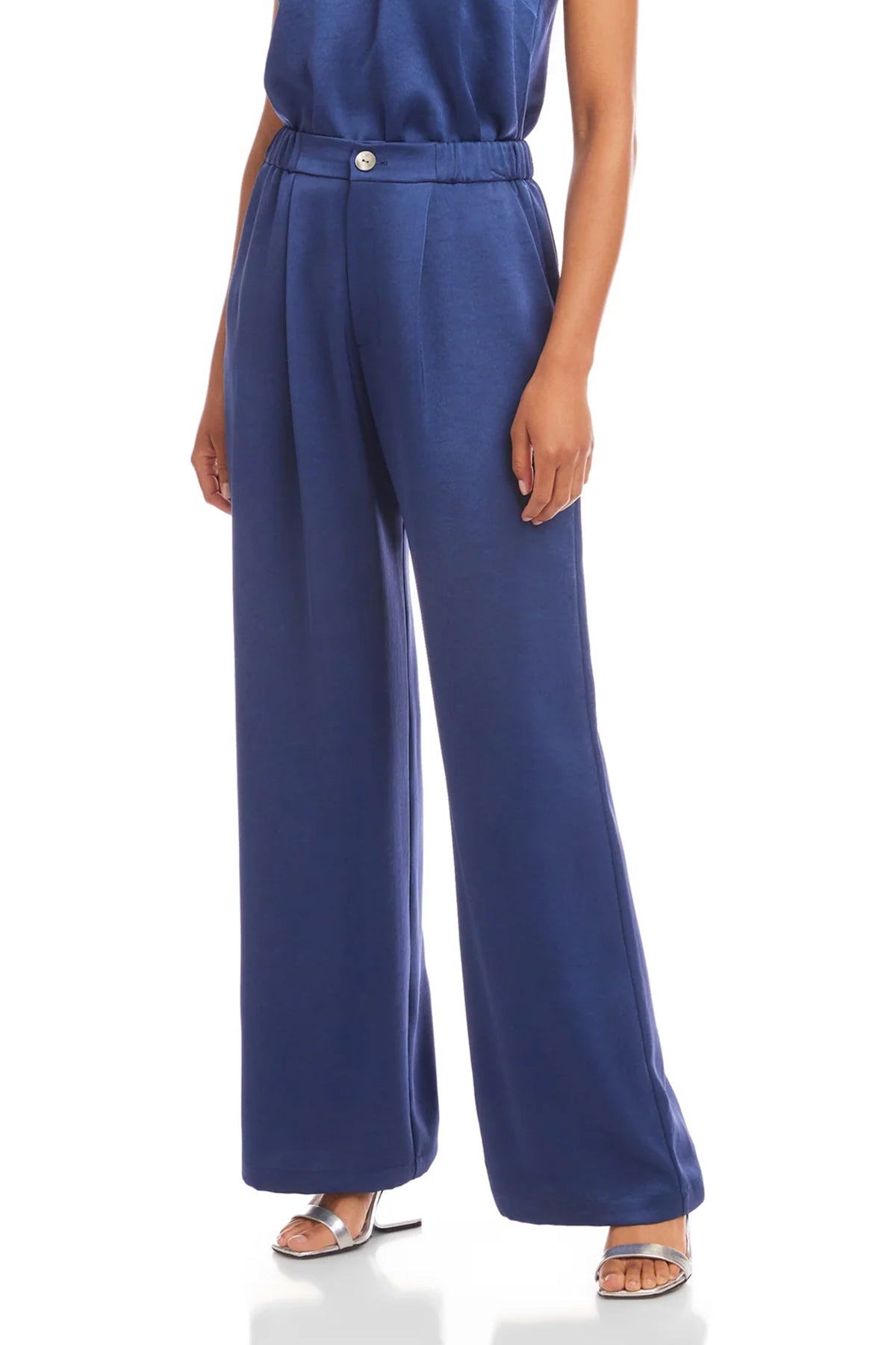 - High-rise fit with pleated front, elasticized back waistband, and a full-length wide leg.