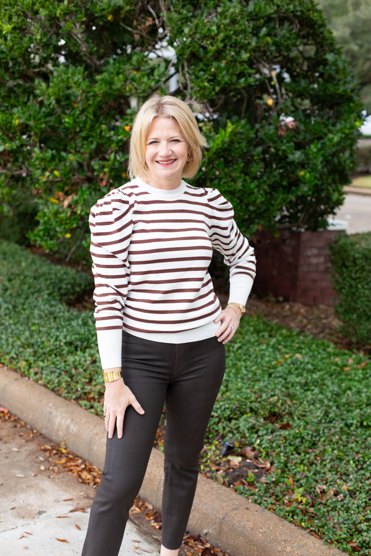 This striped sweater top blends casual ease with refined knit texture. Its clean lines and classic pattern make it an effortless piece for everyday styling.