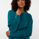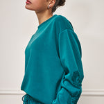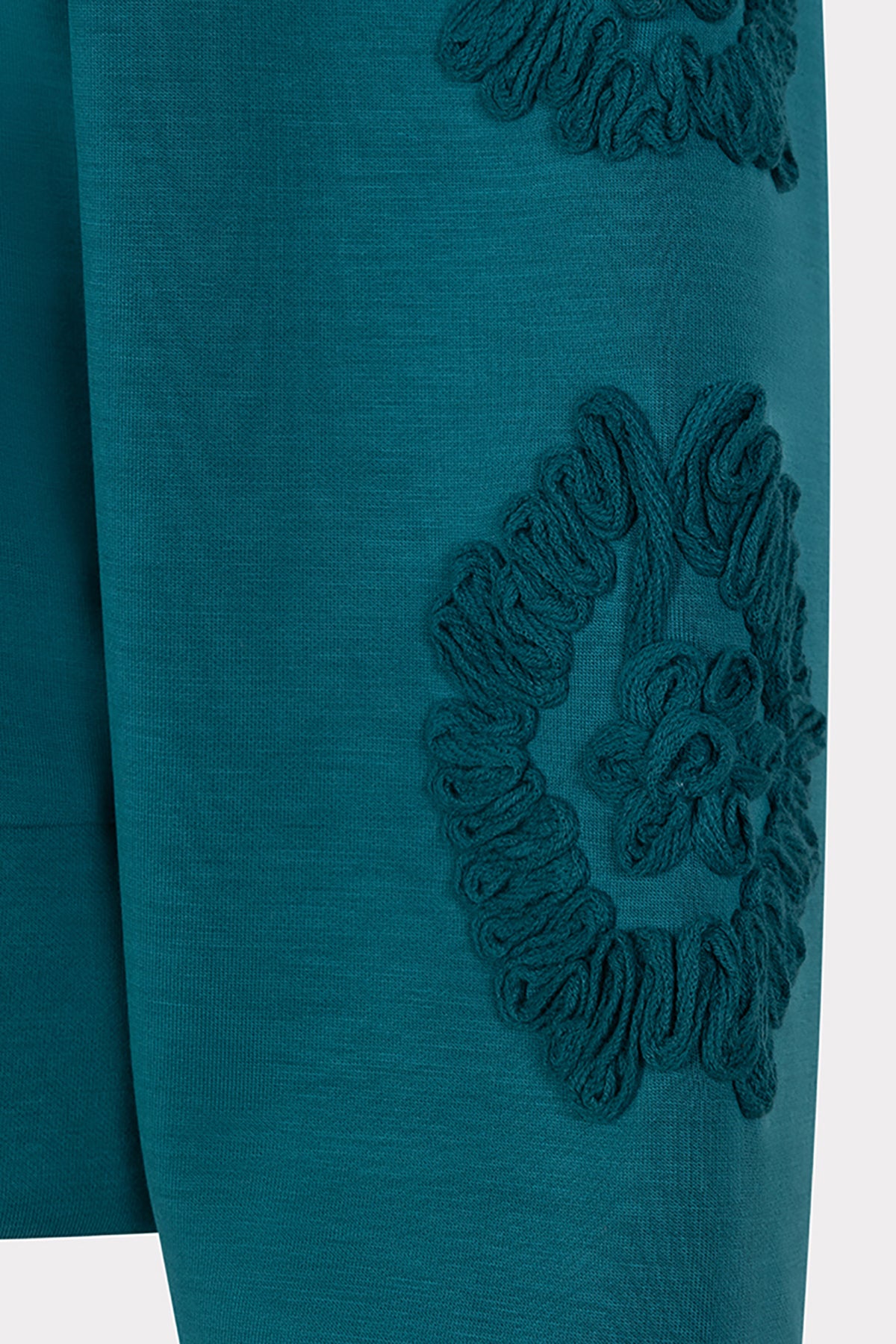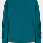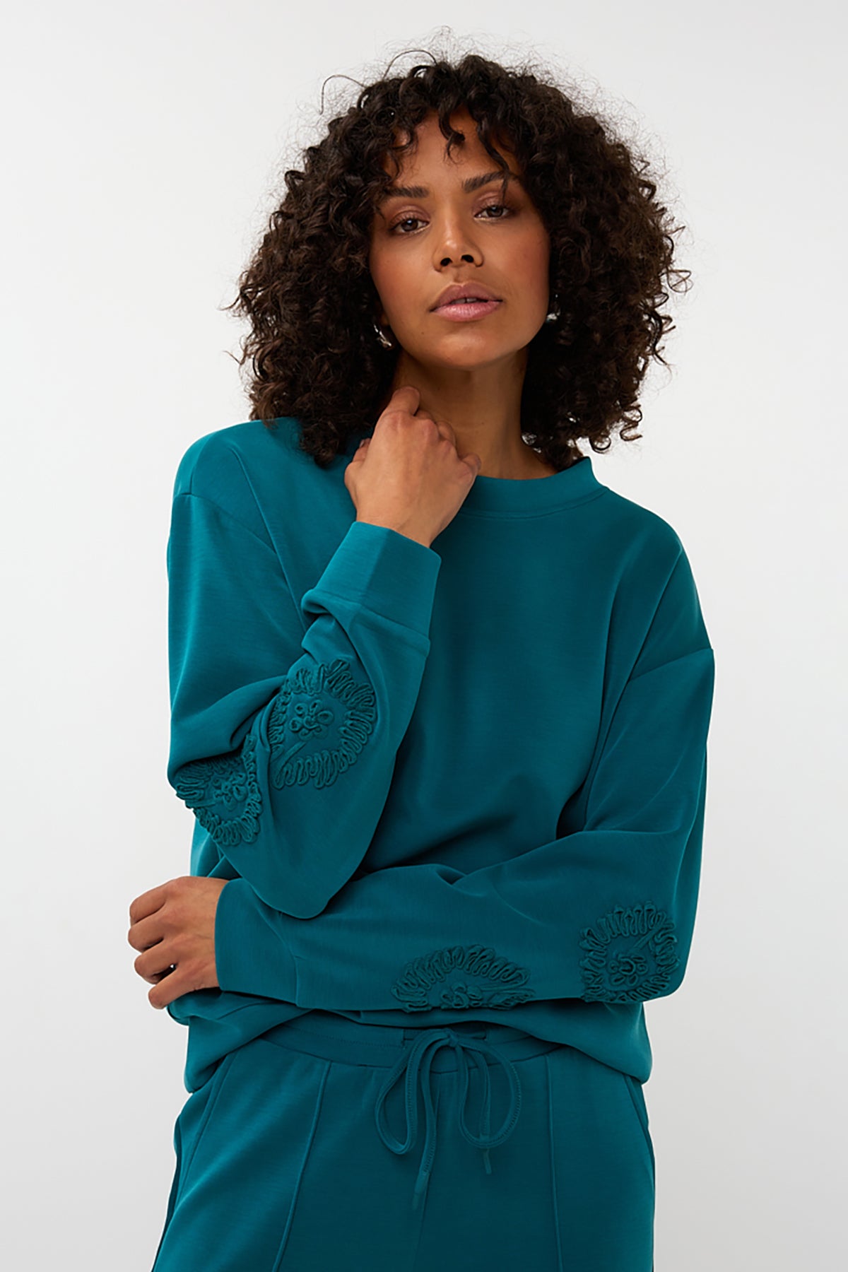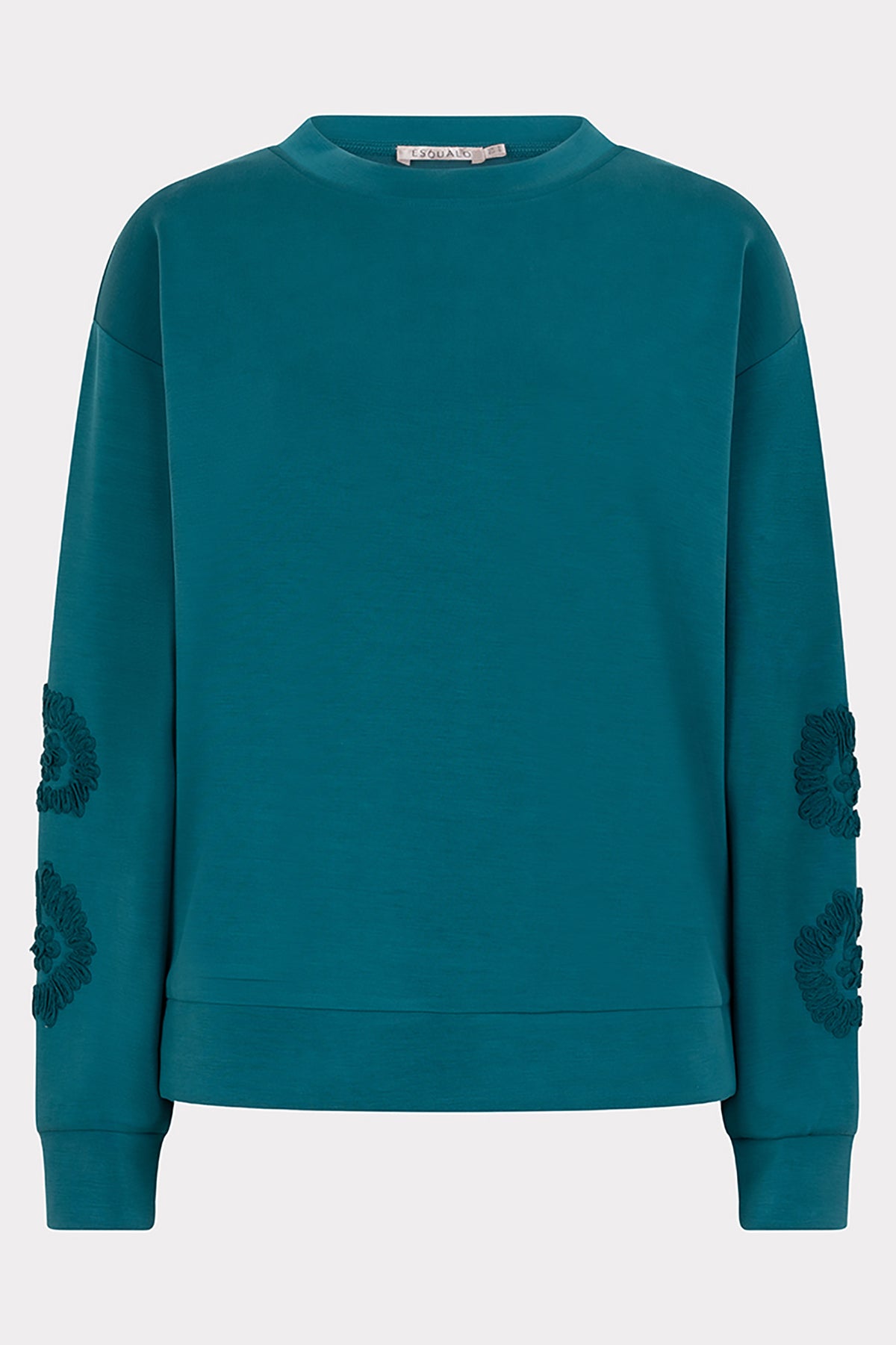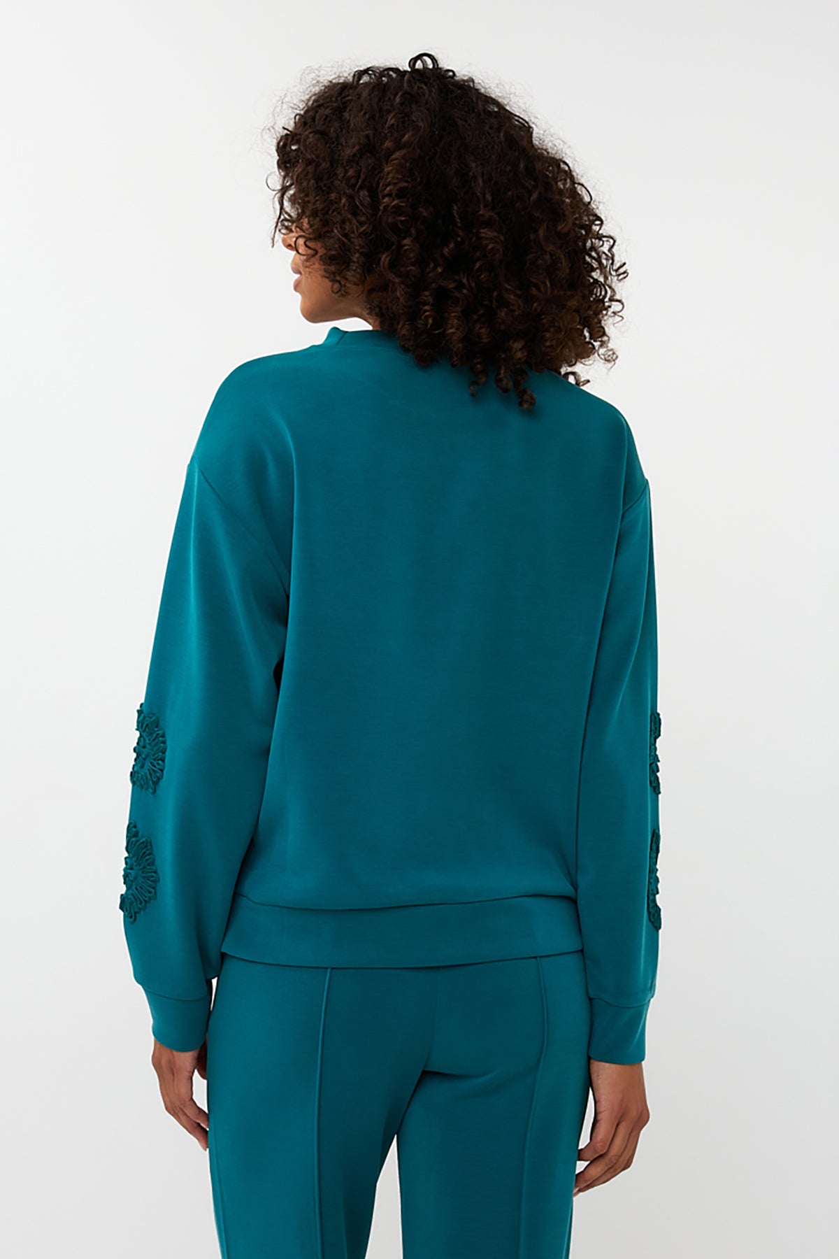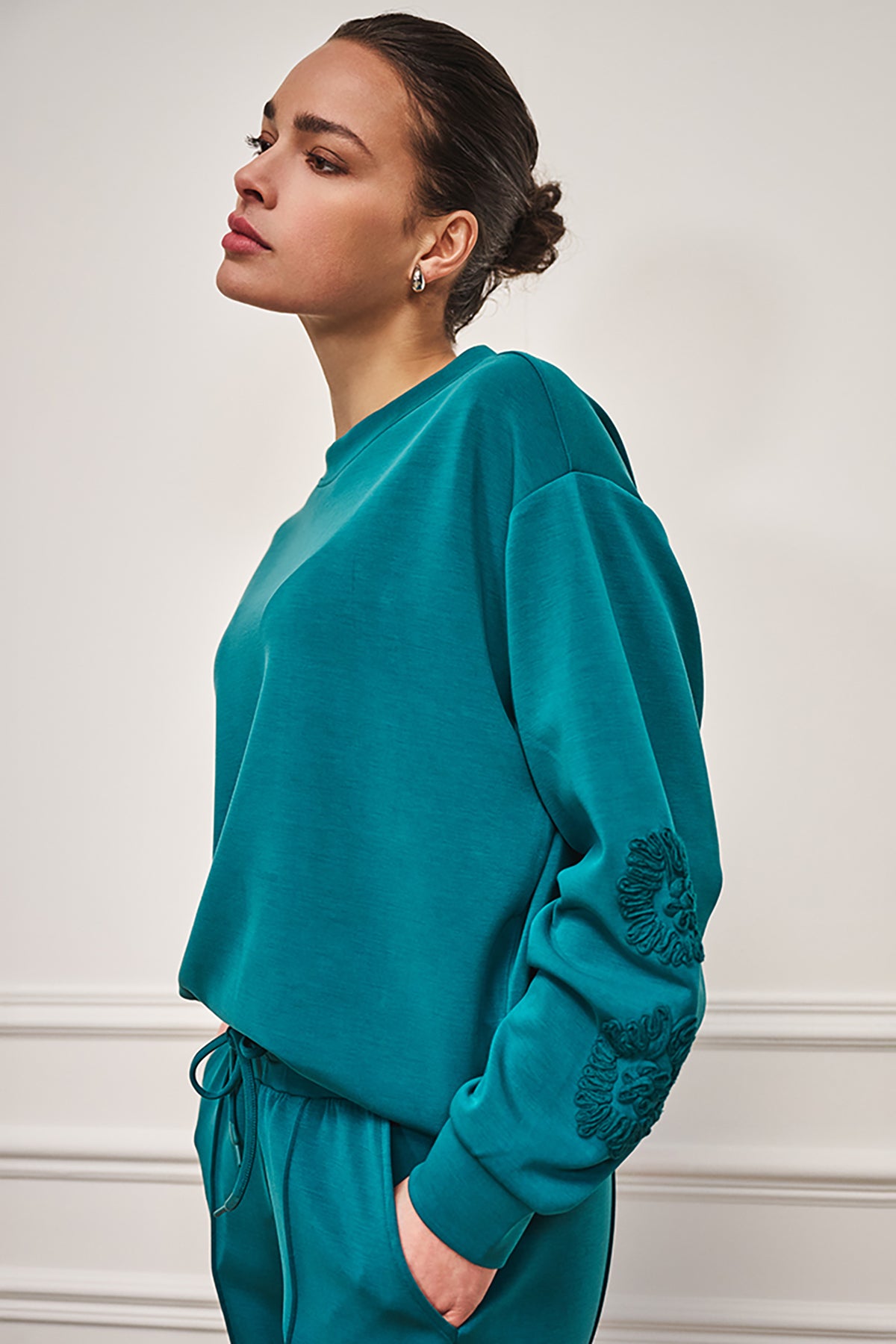 Teal sweatshirt with tape embroidery on the sleeves, made from soft modal fabric for comfort and style.