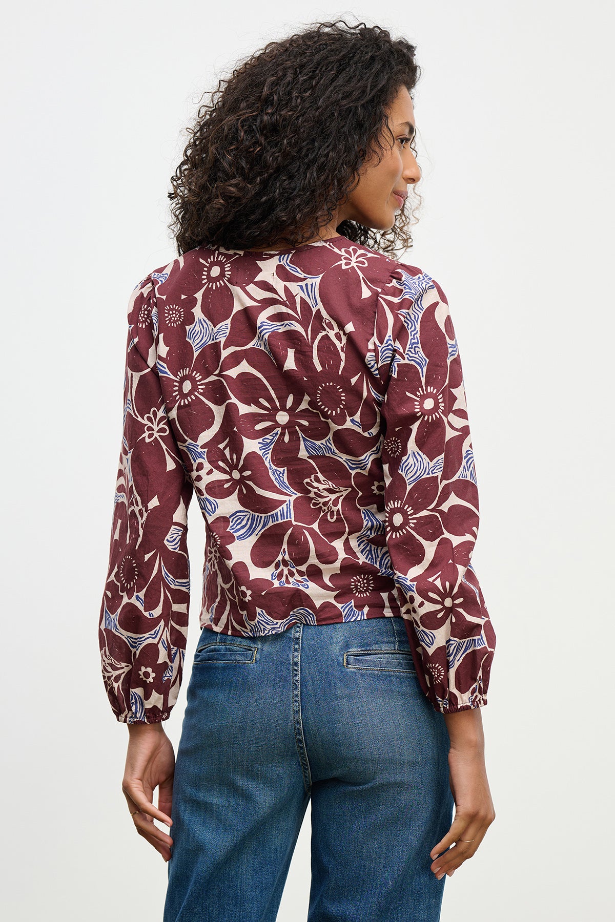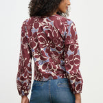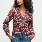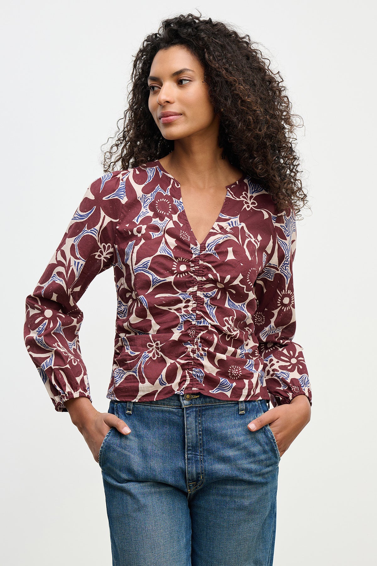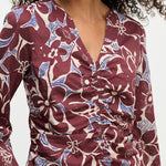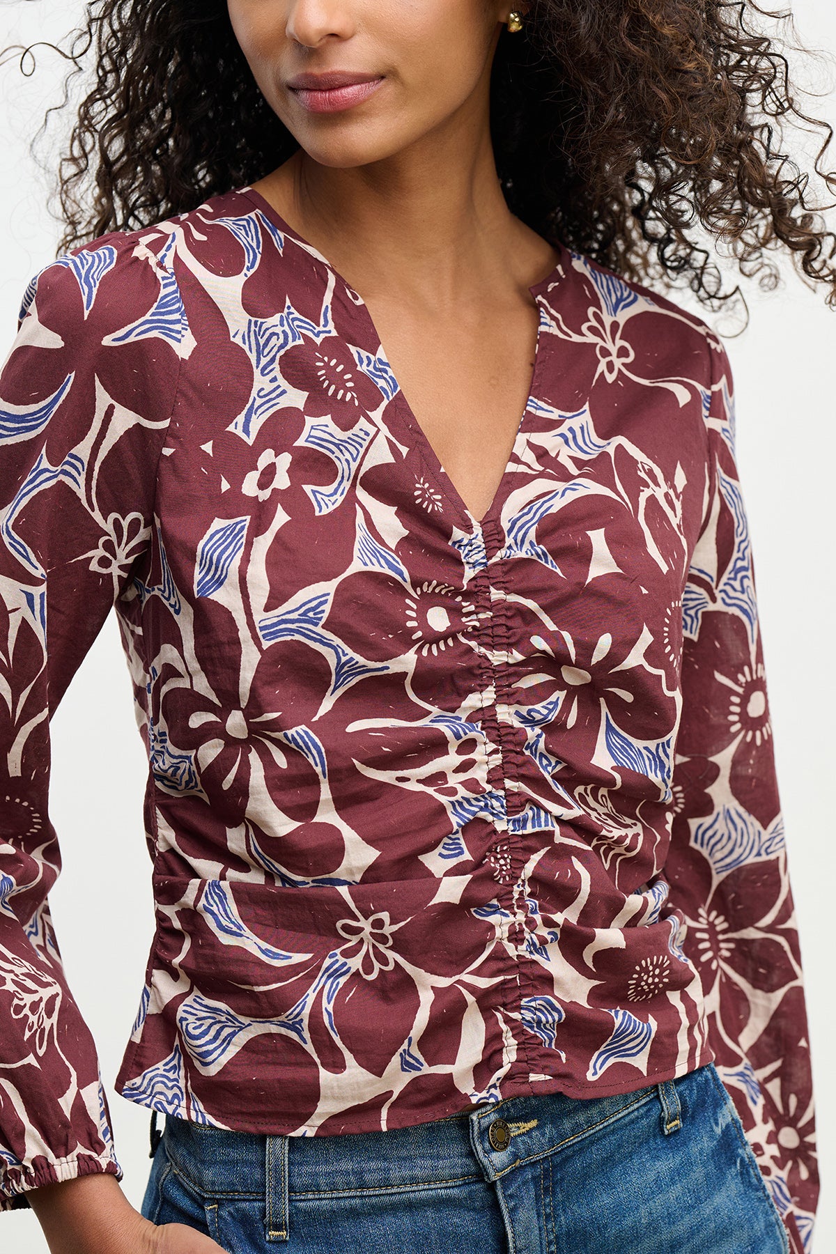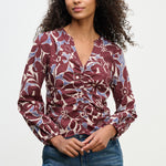 The Sydney top features a printed design with a ruched front and long sleeves, offering a flattering and comfortable fit for any occasion.