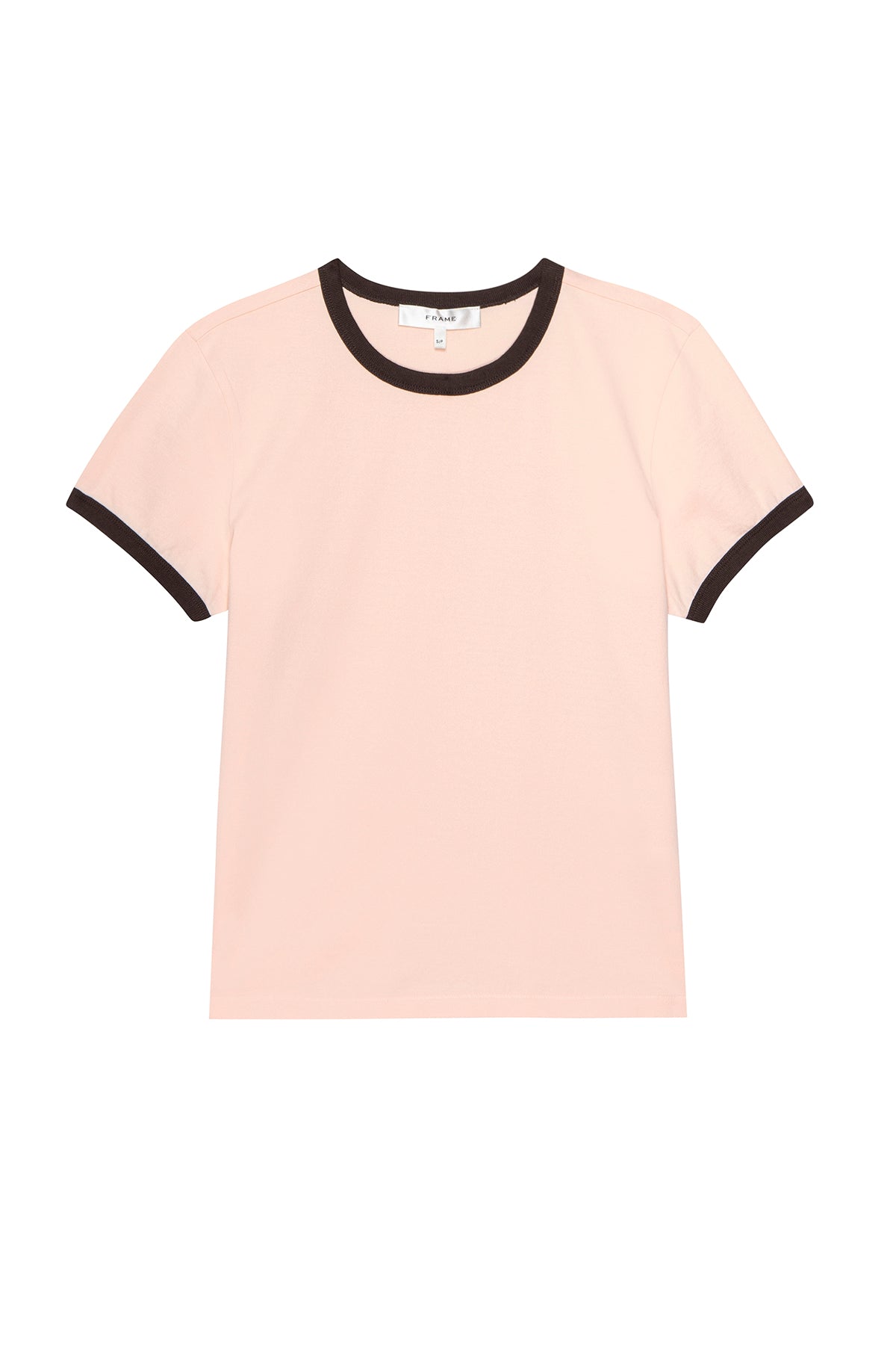 The Ringer Baby Tee is a light pink shirt with brown hems, combining comfort and style for everyday wear.