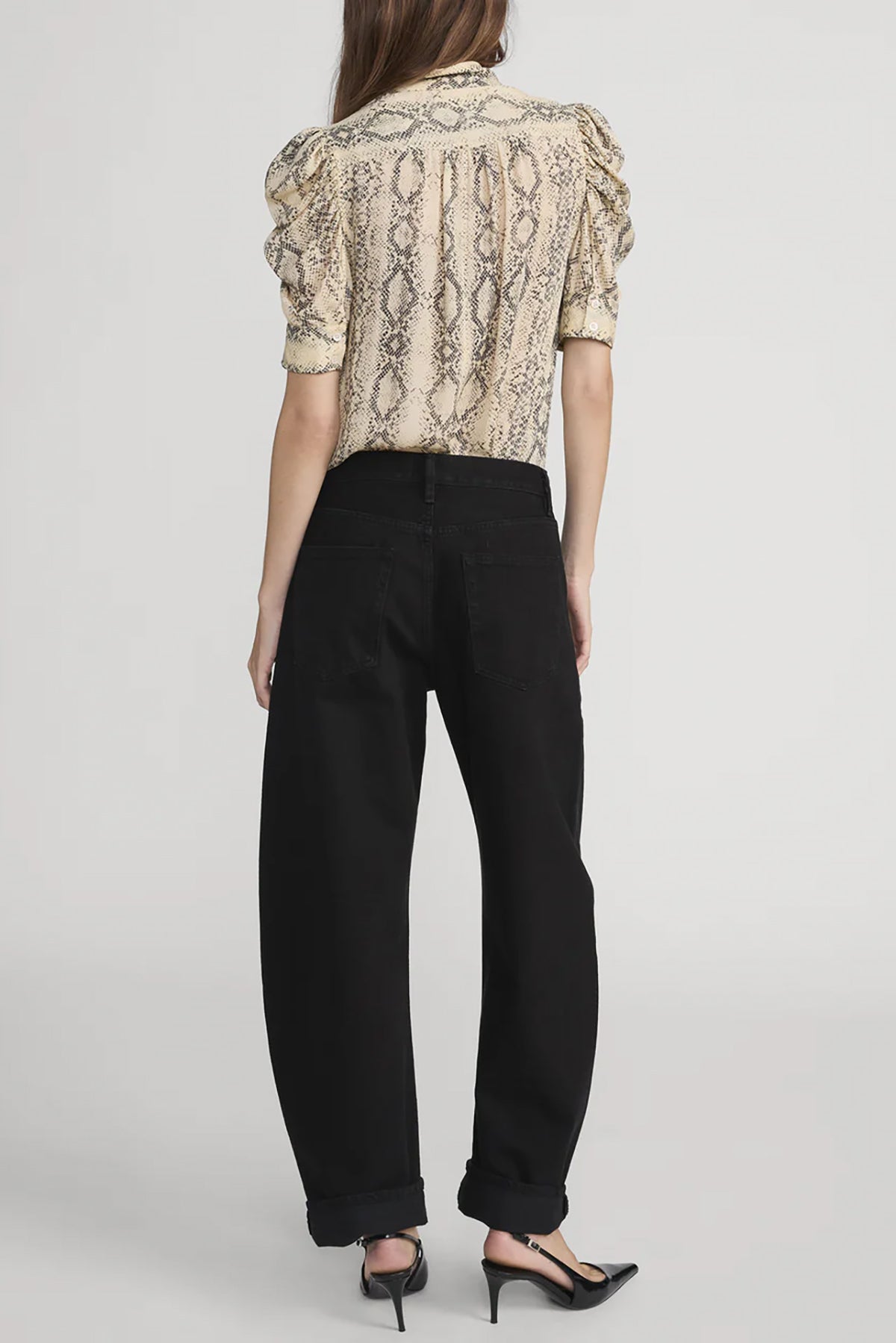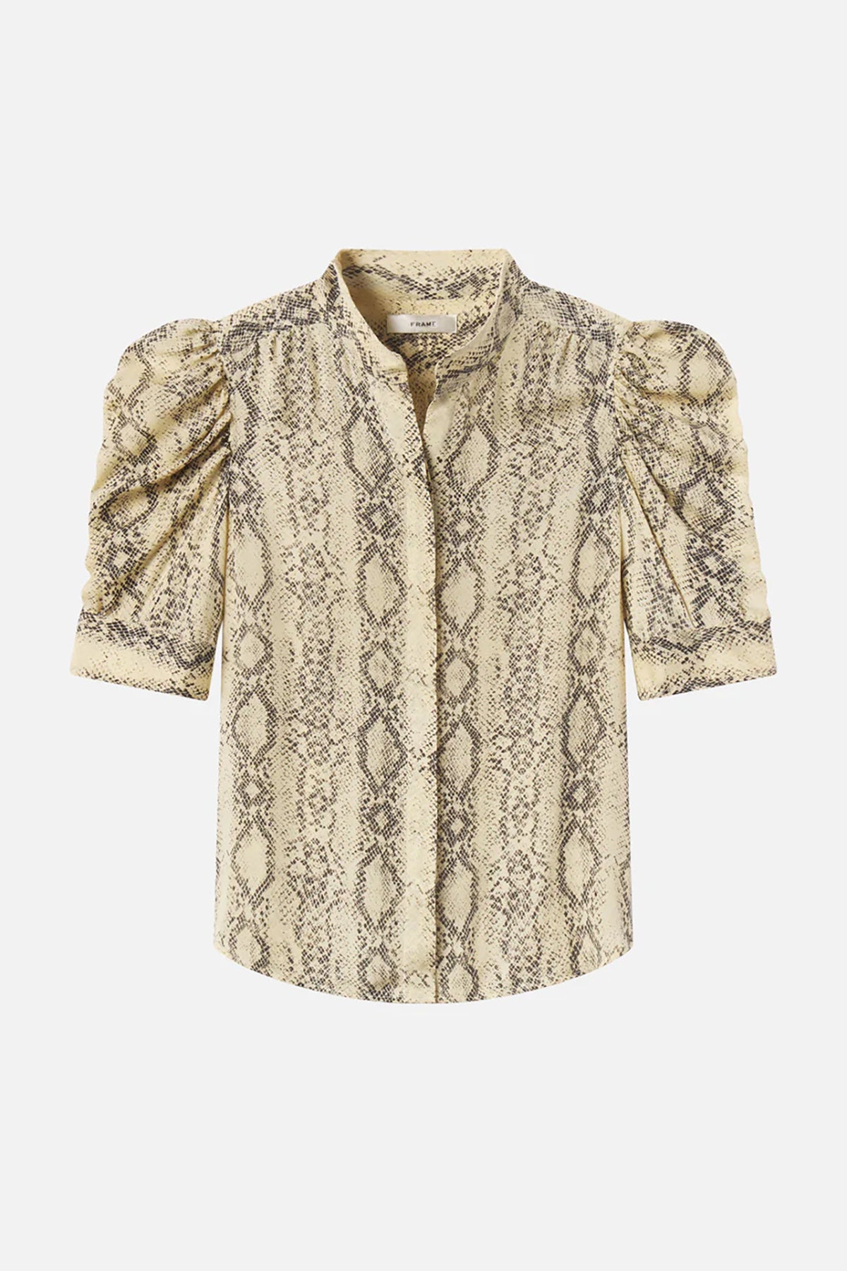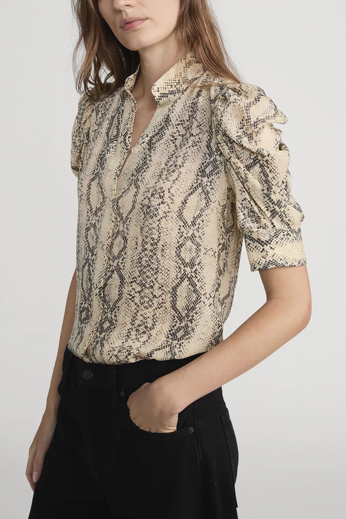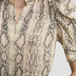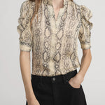 Make a statement with The Snake Gillian Top. This button-down blouse features a bold snake print and romantic puffed sleeves that work for any occasion. Wear it solo or layered for instant style.