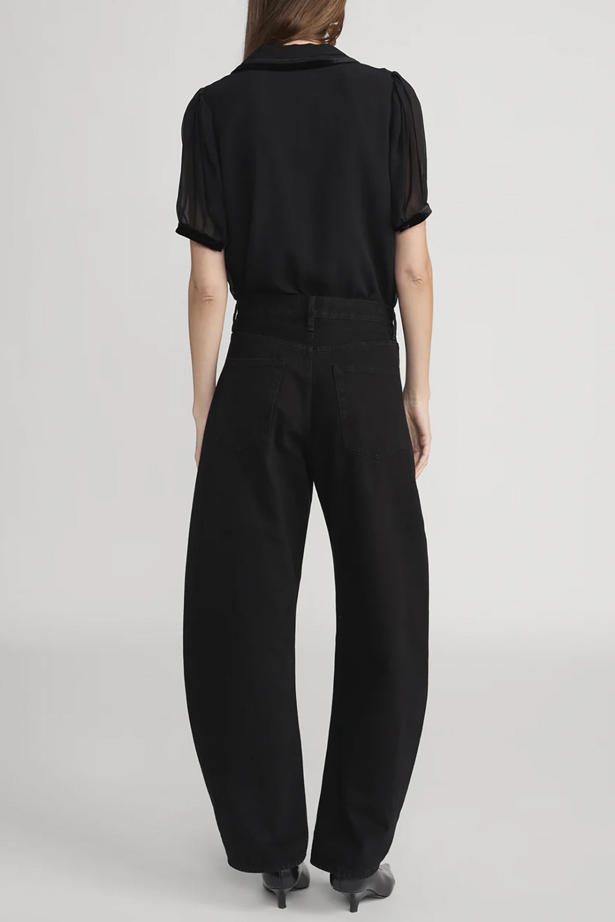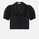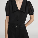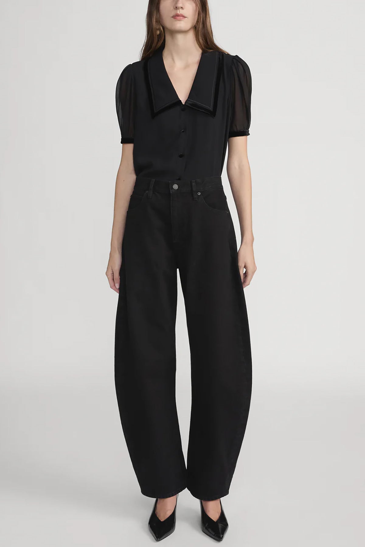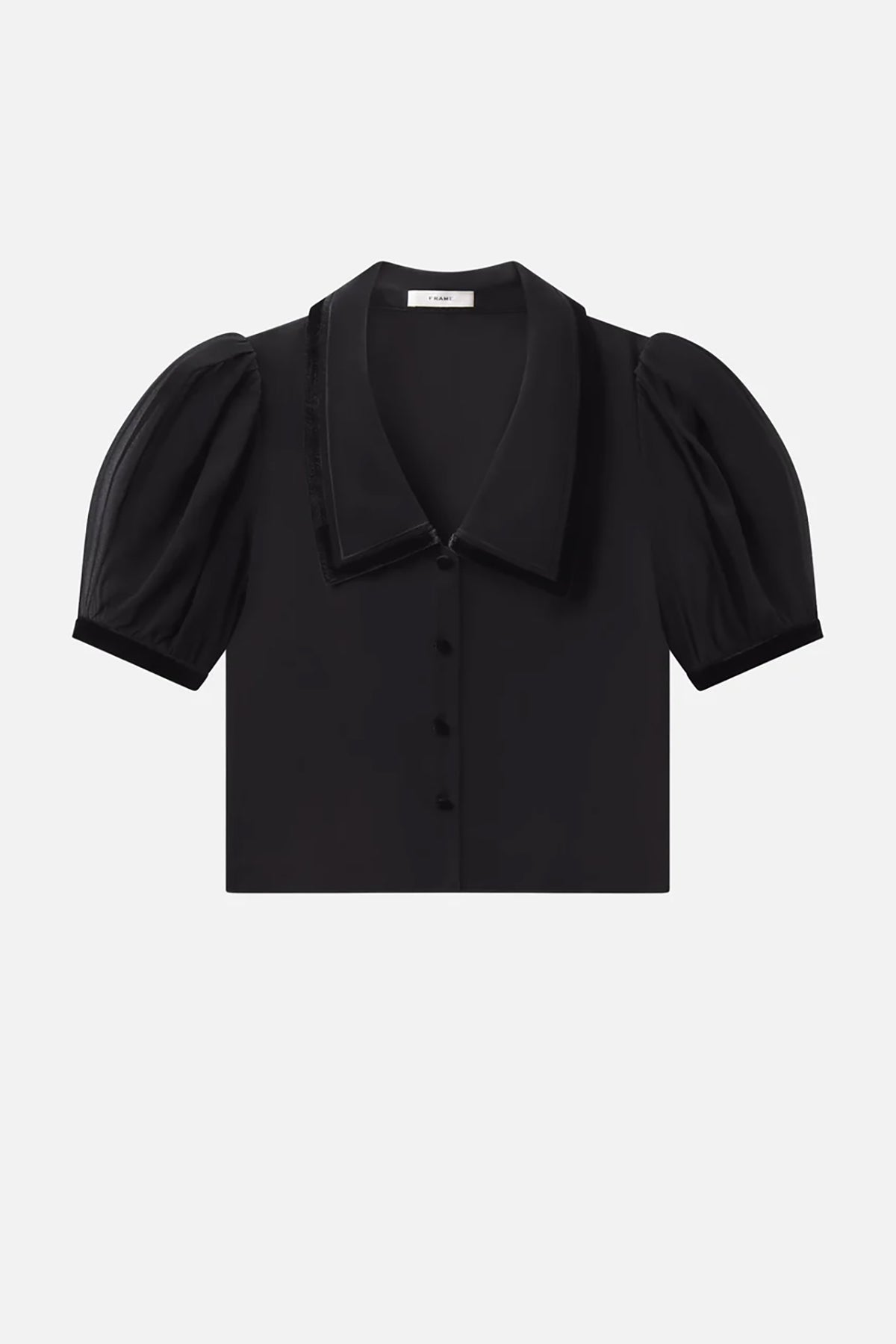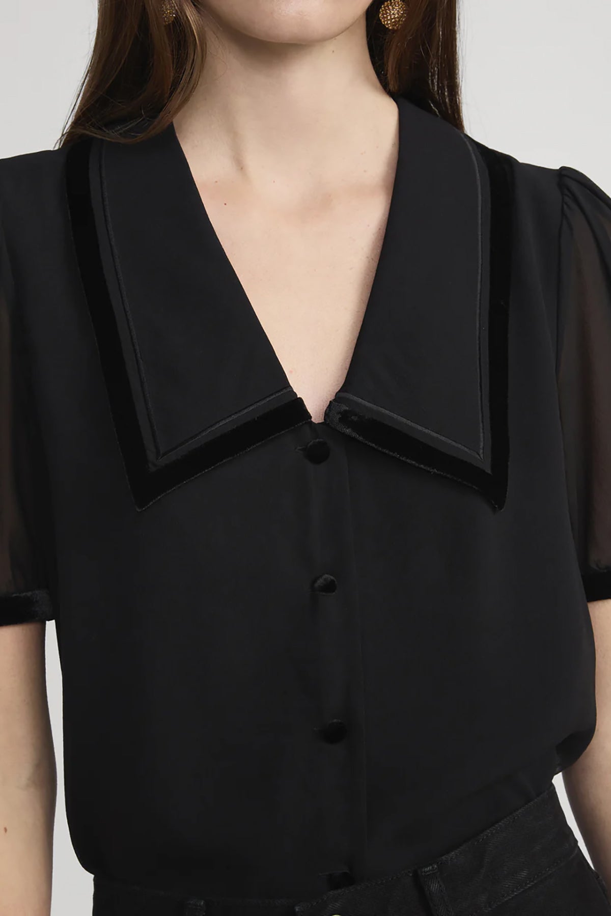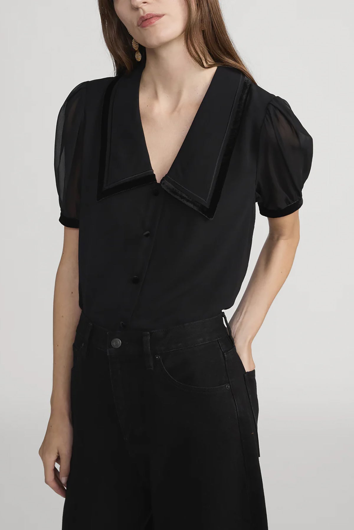 A chic sailor blouse with luxe velvet trim detailing. The classic collar and soft velvet accents create an elegant, versatile piece that works for any occasion—from casual to dressy.