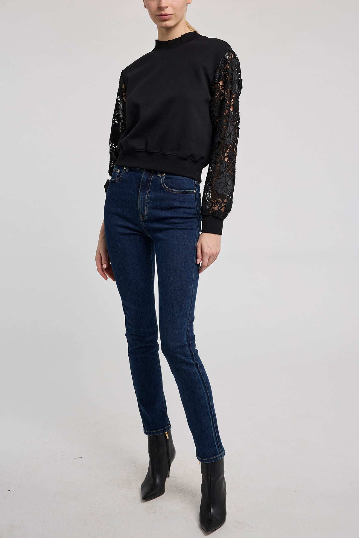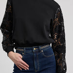 The Theron Guipure Combo Sleeve Sweatshirt offers a comfortable fit with stylish lace sleeves, perfect for a cozy yet fashionable look.