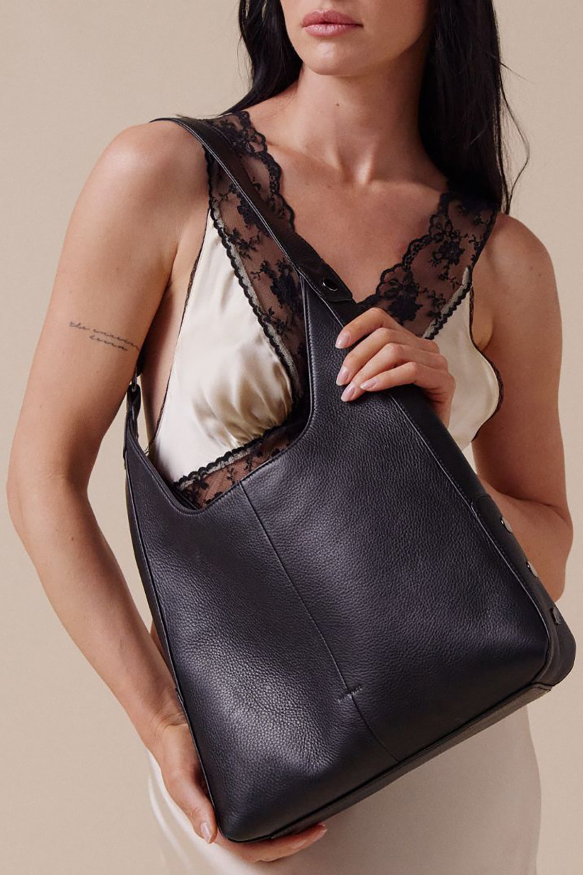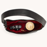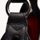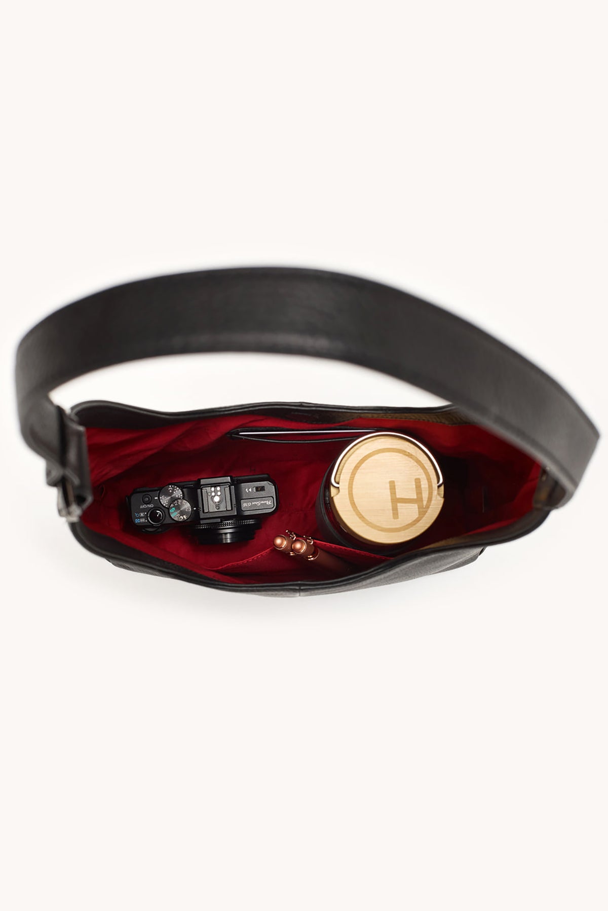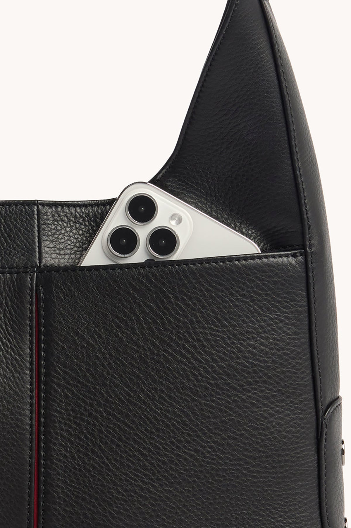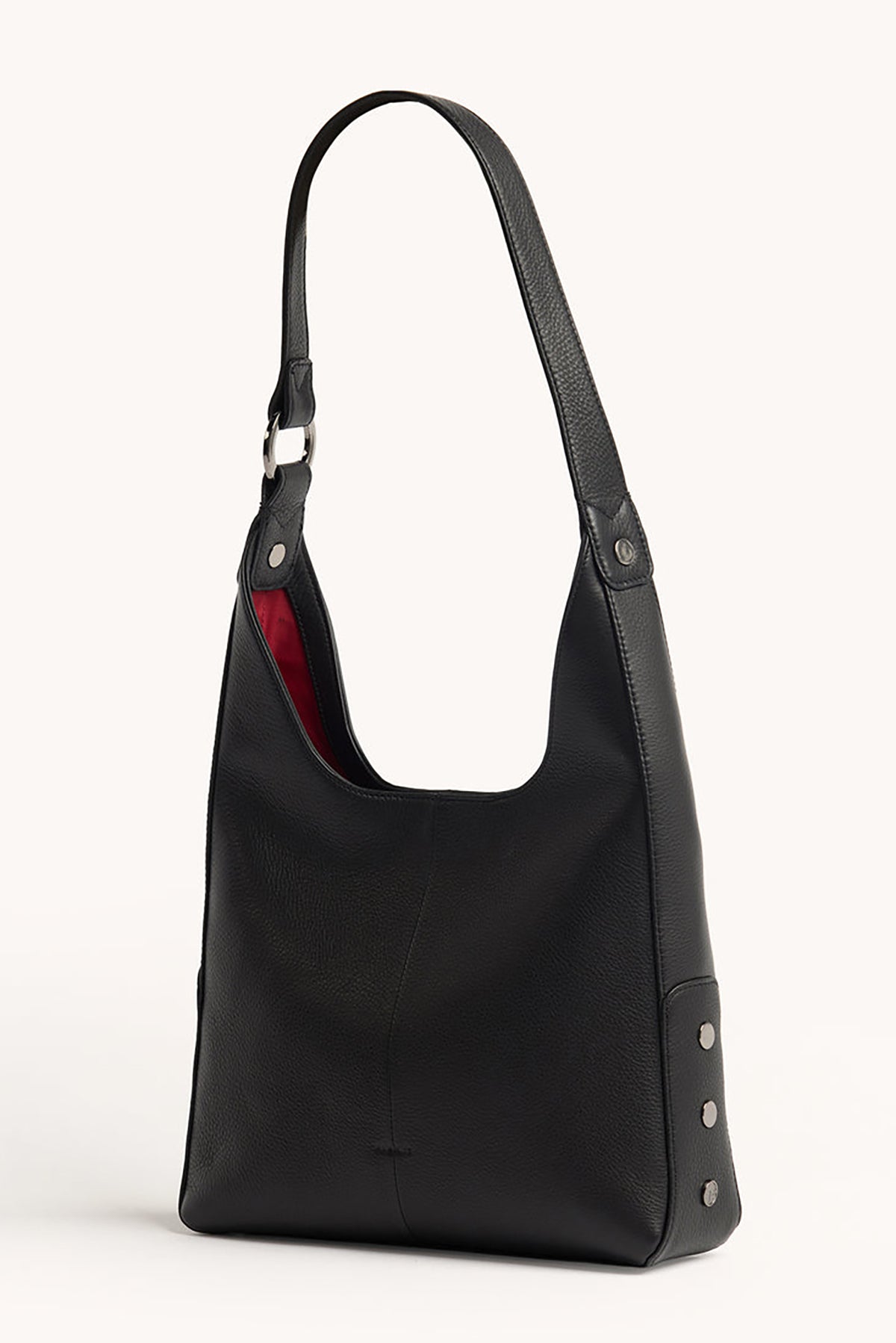 The Tim Med features black pebbled leather, gunmetal hardware, and a magnetic top closure. It includes a back pocket, decorative details, and a red-lined interior with card and drop pockets for stylish everyday use.
