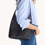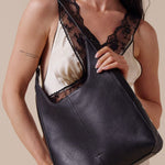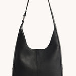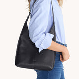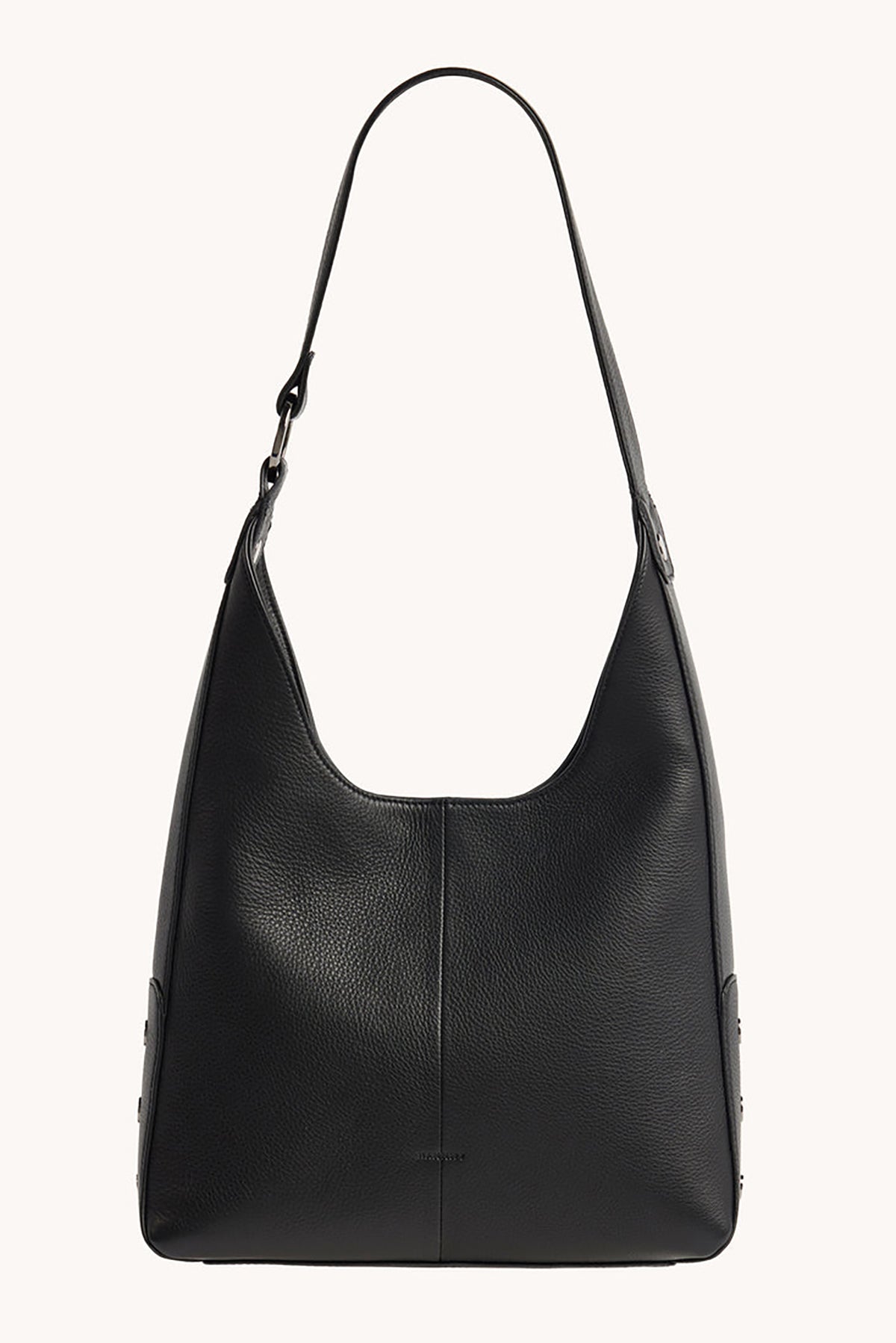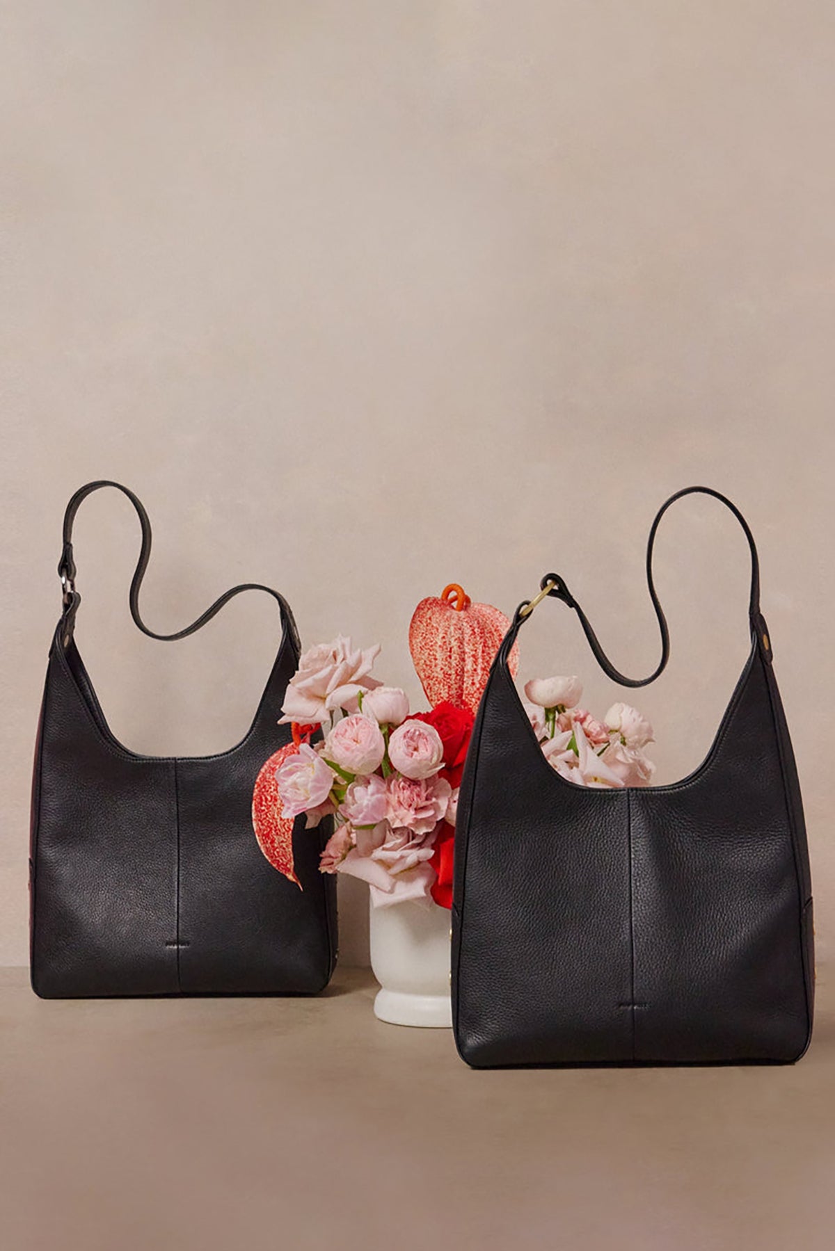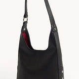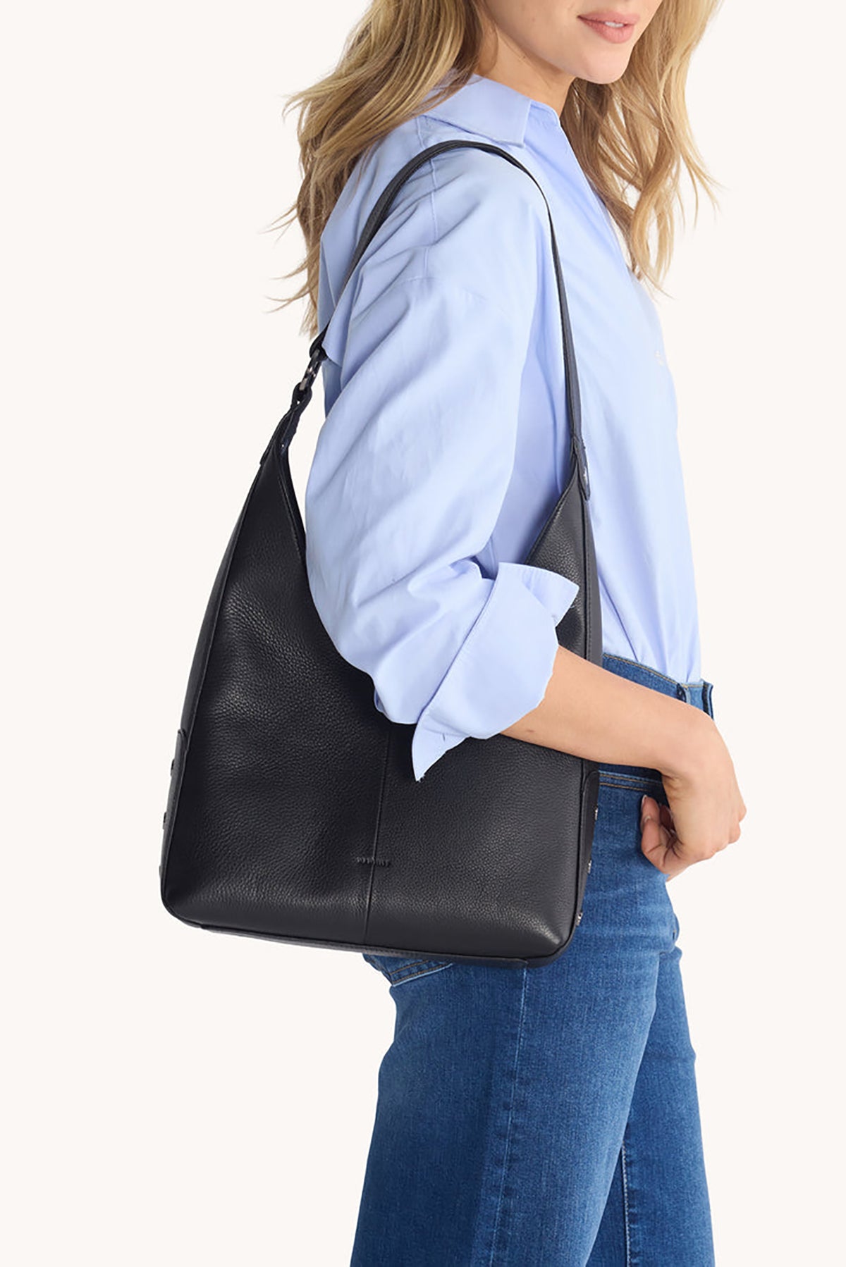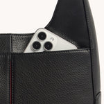 The Tim Med features black pebbled leather, gunmetal hardware, and a magnetic top closure. It includes a back pocket, decorative details, and a red-lined interior with card and drop pockets for stylish everyday use.