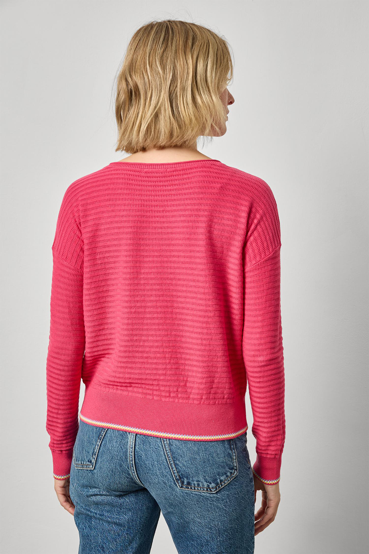 A wide neckline and contrast hem detailing bring quiet distinction to this refined sweater. The relaxed shape and thoughtful finish make it an easy piece to dress up or down.