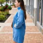 This blue turtleneck tunic dress combines comfort with understated style. Featuring a graceful extended hemline and snug long sleeves, it flatters your frame whether worn solo or paired with tights. The premium knit construction delivers gentle warmth while maintaining a streamlined fit, and the iconic turtleneck collar brings polished charm to any look. Ideal for layering through changing seasons, this go-to piece transitions seamlessly between elevated settings and casual weekend plans!