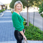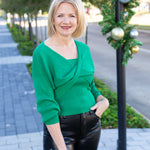 This green twist front sweater combines style and comfort in one versatile piece. The twisted front detail creates an elegant look that works for any occasion, whether dressed up or down.