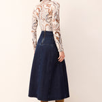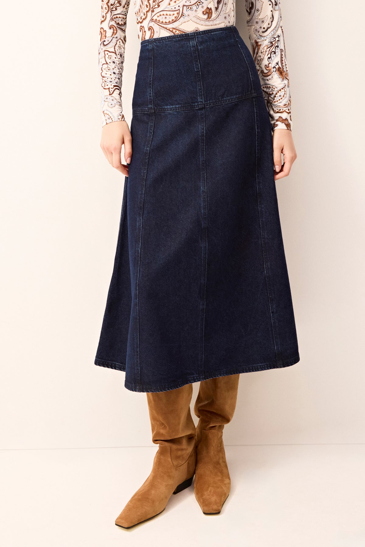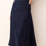 Elevate your everyday style with the Yuko Skirt, a timeless dark wash denim midi that effortlessly transitions from day to night. Crafted from quality denim with a flattering silhouette, this versatile piece pairs beautifully with everything from crisp white tees to fitted sweaters and tops. The midi length offers modern sophistication while maintaining that classic denim appeal.