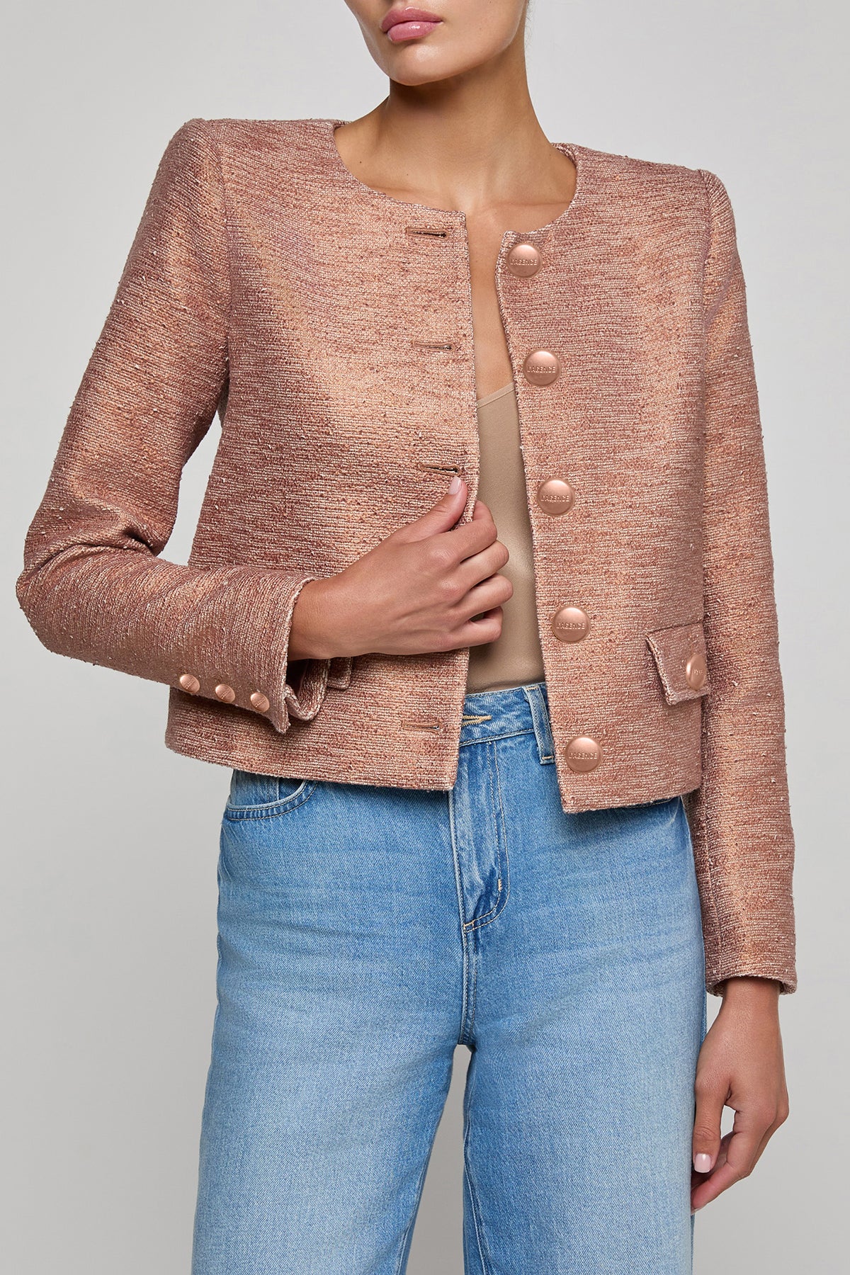 Refined and modern, the Zell Jacket offers a collarless design that feels clean and architectural. Its tailored shape brings polish to any outfit while remaining easy to style.