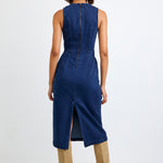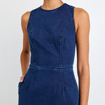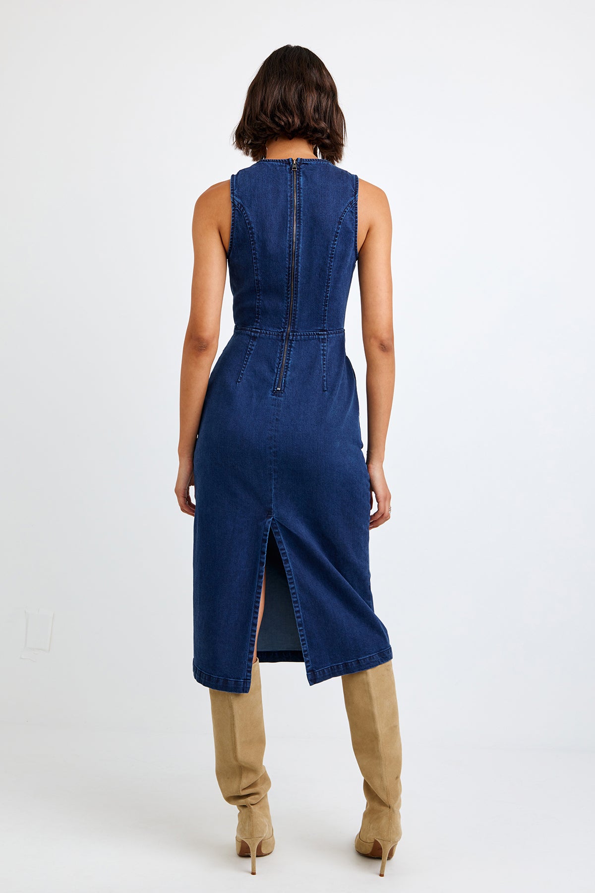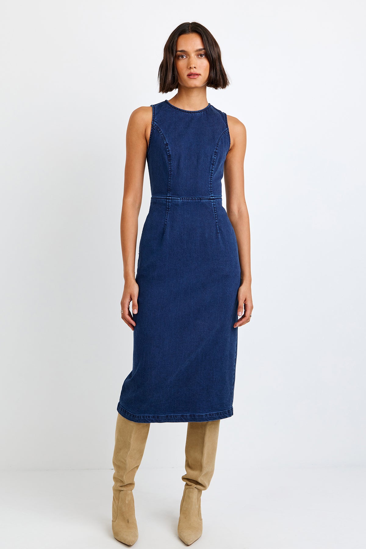The Zip Back Maxi Dress is a sleeveless denim dress with a maxi length and a zip-back detail, perfect for elevated, stylish wear.
